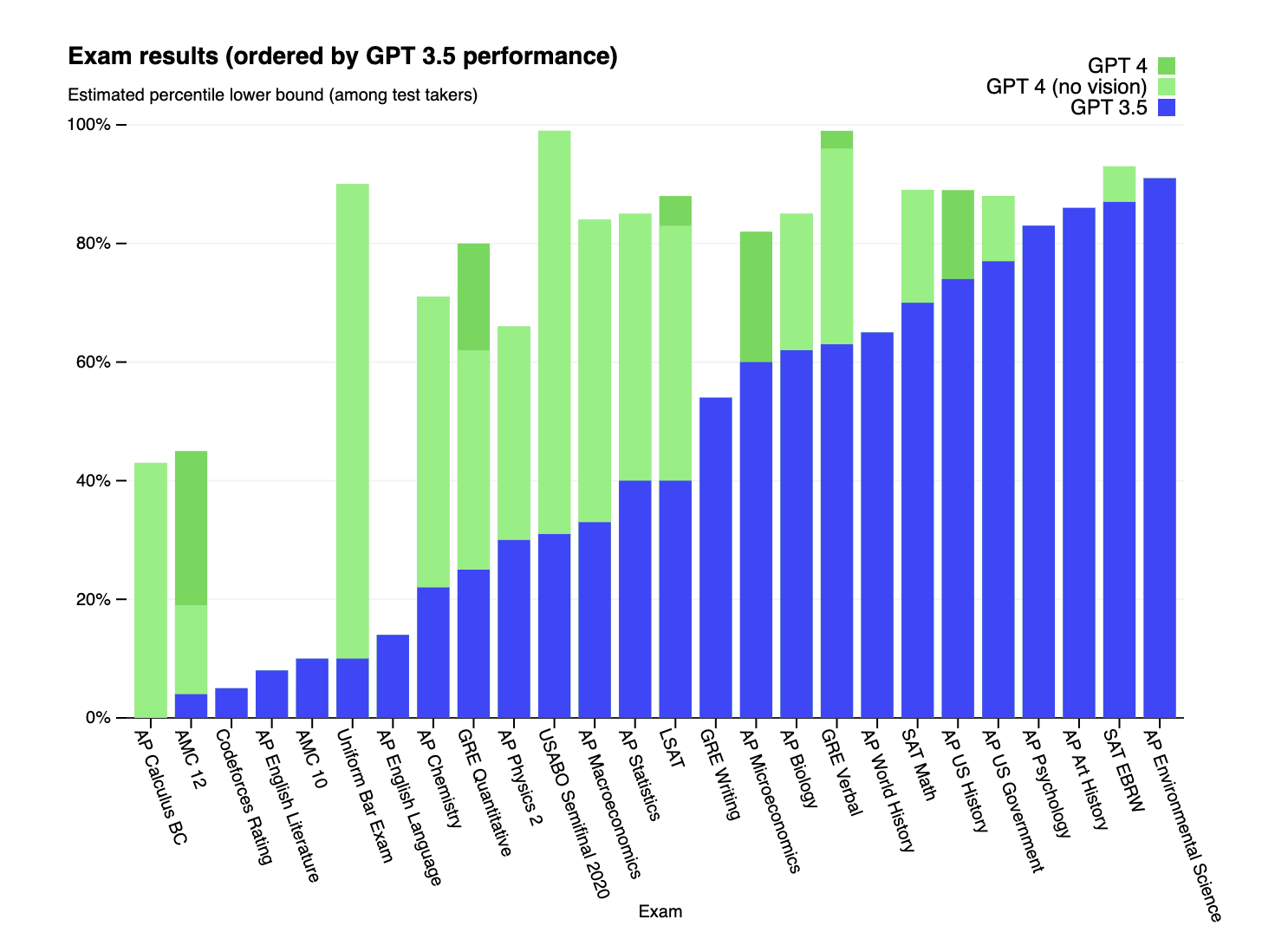 Bu yeni yeteneklere, daha iyi bir muhakeme kabiliyetinin eklendiğini de belirtelim. GPT-4 birden fazla veri noktası içeren karmaşık soruları daha iyi bir şekilde çözüyor. GPT-4'un diğer modele kıyasla sınavlarda gösterdiği yüksek başarı oranlarını görmek mümkün.