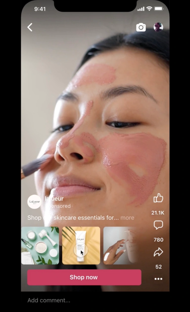 Alışveriş reklamlarında ise Reels, doğrudan web siteye ya da ürün sayfasına yönlendirilen reklamlar yerine çoklu varış noktası içeren yeni ürün reklamlarını duyurdu. Böylece kullanıcılar, Reels reklamını terketmeden aşağıda yer alan carousel üzerinden birden fazla ürün görselini inceleyebilecek.