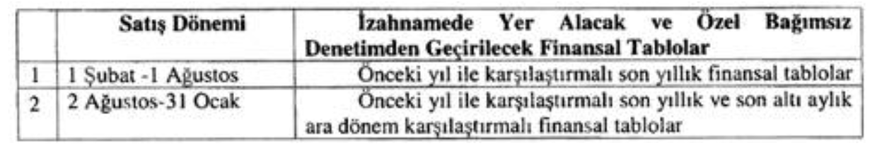 İzahnamede yer alacak finansal tablolar aşağıdaki esaslara göre belirleniyor. Bu fıkra kapsamında satış döneminin tespitinde, payların satışa sunulduğu ilk gün esas alınıyor.