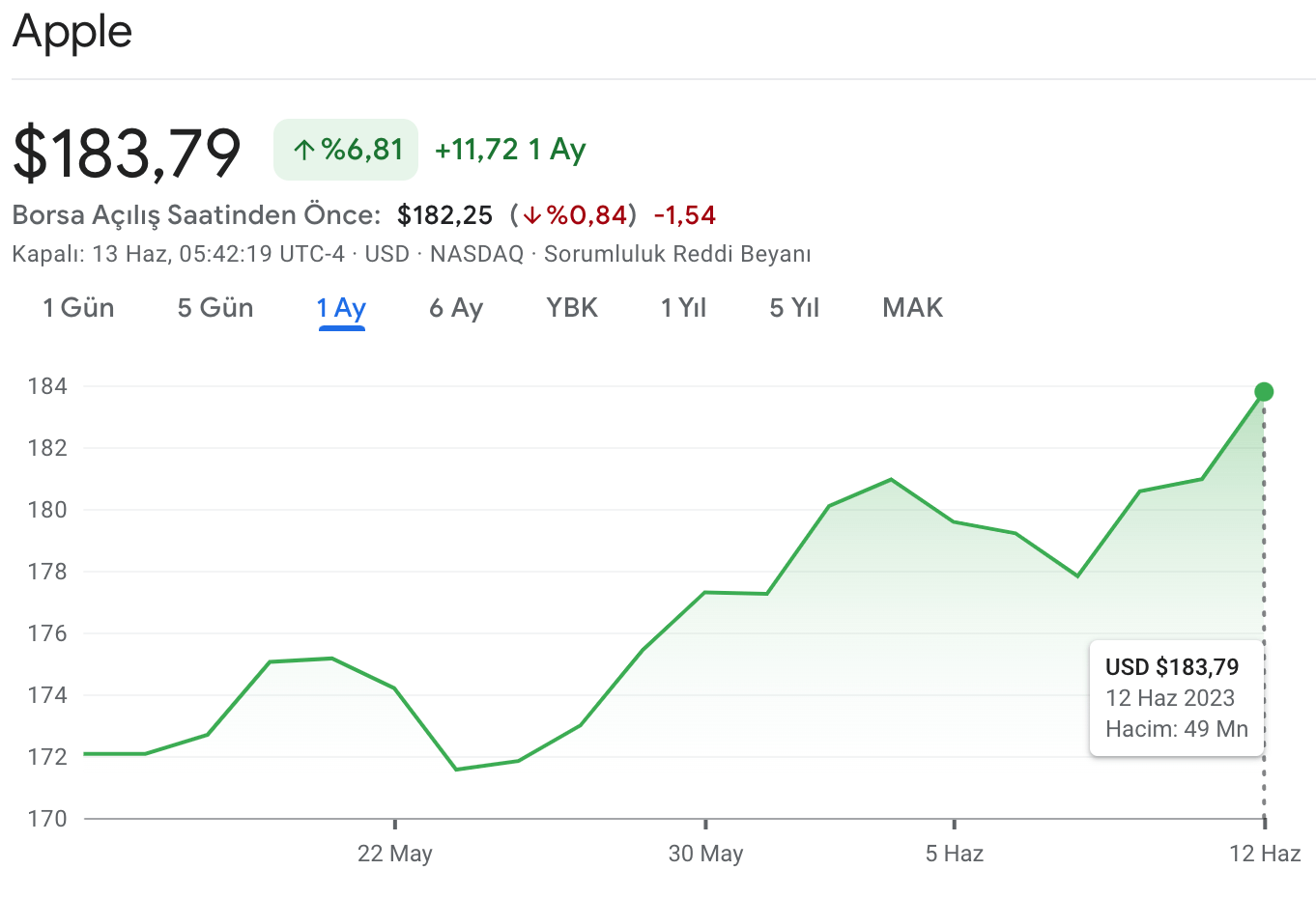 Geçtiğimiz yılın Aralık ayında iPhone tedariğinde yaşanan sorunlar nedeniyle hisseleri düşen Apple, Ocak ayında ise önemli bir yükseliş yakalayarak 3 trilyon dolar değerine ulaşmıştı. 5 Haziran tarihinde düzenlediği WWDC 2023'te ilk karma gerçeklik gözlüğü olan Vision Pro modelini tanıtan Apple, tüm teknoloji dünyasının ilgisini çekmeyi başardı.