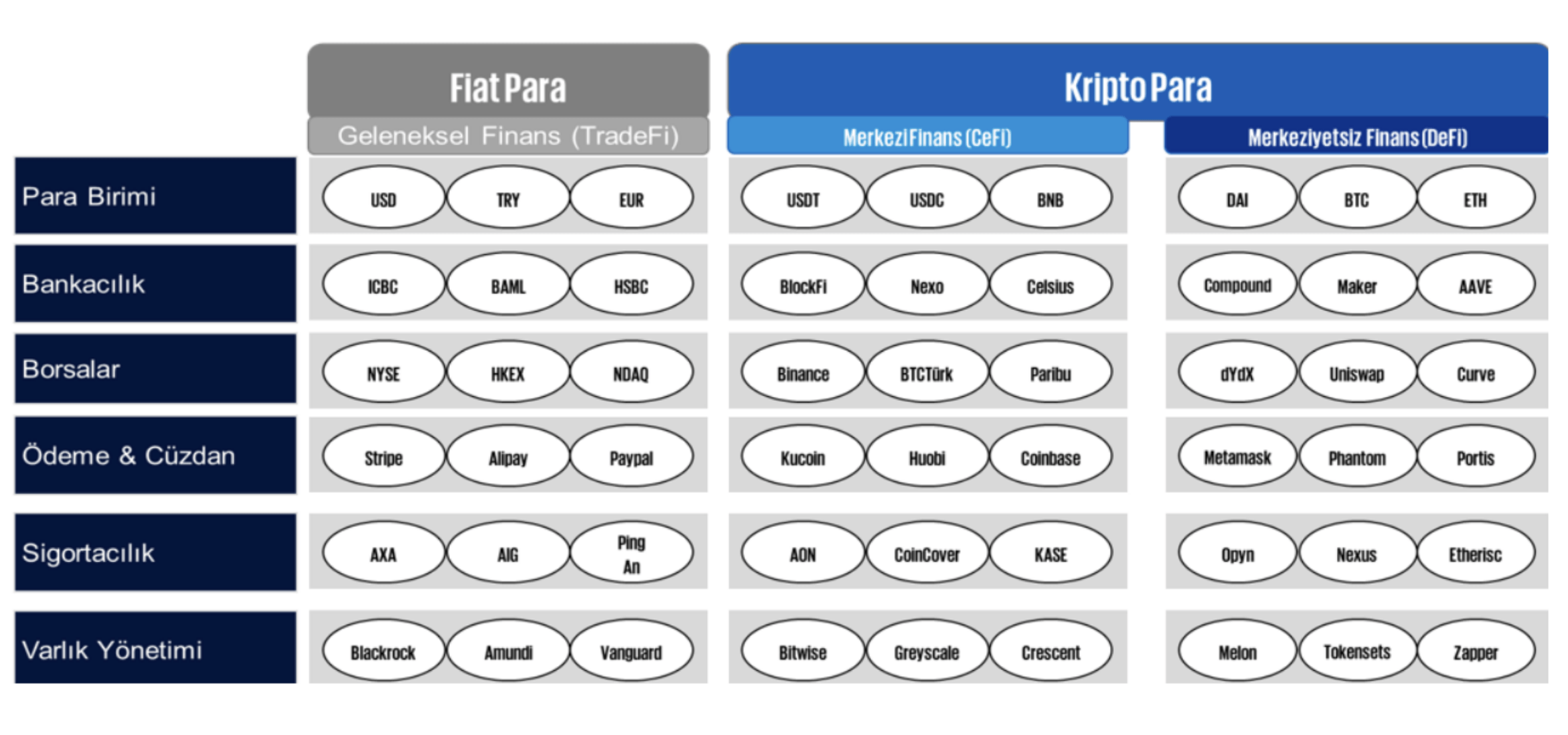 Raporda CeFi ve DeFi'lar mercek altına alınıyor. Geleneksel finansal hizmetlerin merkezi bir otoritenin kontrolü altında olduğu CeFi(merkezi finans) platformları, belirli yasal gereklilikleri yerine getirme yükümlülüğü altında yer almakta.