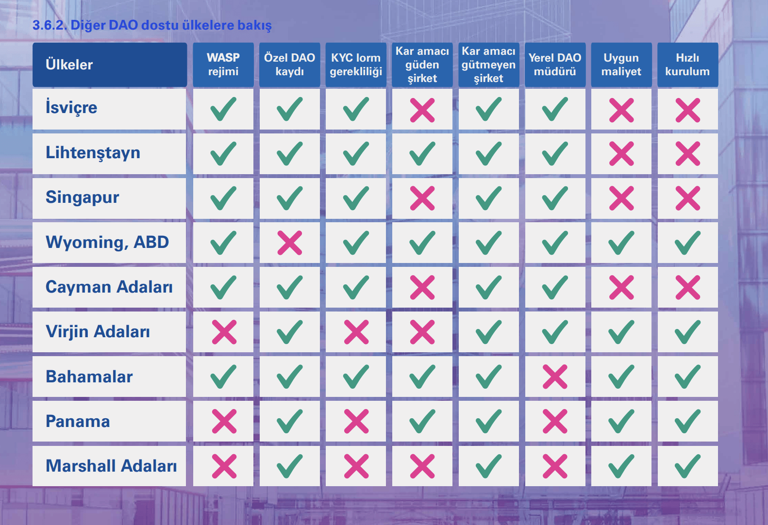 Çoğu ülkede henüz DAO’lar için belirli bir yasal çerçeve oluşturulmamasına rağmen, bazı ülkeler bu konuda öncülük ederek DAO’ları yasal bir kişilik olarak tanımaya başladı. Bazı ülkeler ise DAO’ların yasallığını dolaylı olarak etkileyebilecek dijital para birimleri ve blokzinciri teknolojisine yönelik daha ilerici bir yaklaşım benimsedi.