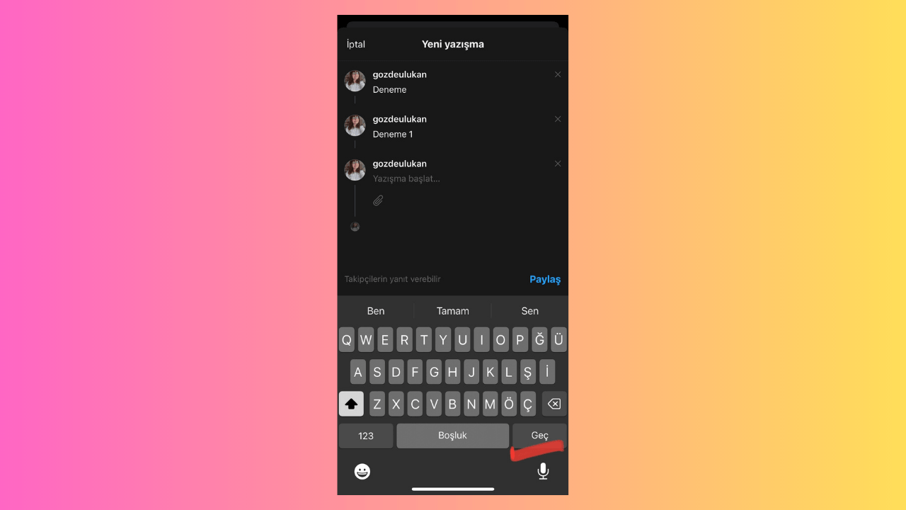 Ancak bunun daha kısa bir yolu var. Bunun için diyelim ki ilk gönderinizi yazdınız, henüz paylaşmadan altına ekleme yapmak istiyorsunuz. Klavyenizde üç kere "geç" kısmına tıkladığınızda ilk paylaşımınızın altına otomatik olarak yenileri açılıyor.