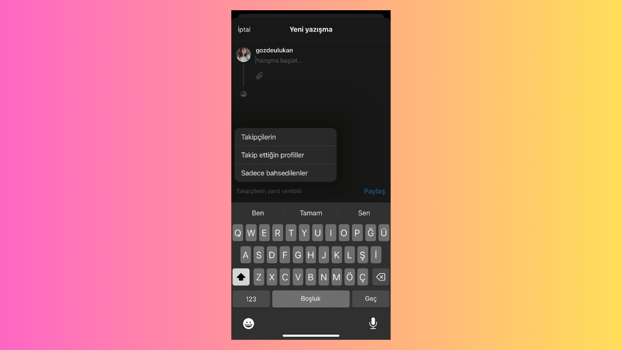 Threads'te yeni bir ileti dizisi paylaşmadan önce, söz konusu ileti dizisini kimlerin yanıtlayabileceğini ayarlayabilmek mümkün. Bu kapsamda üç seçenek bulunuyor: Herkes, takip ettiğiniz profiller, yalnızca bahsettikleriniz. Söz konusu ayarlama için yazışma başlatılan bölümde klavyenizin hemen üstüne göz atabilirsiniz.