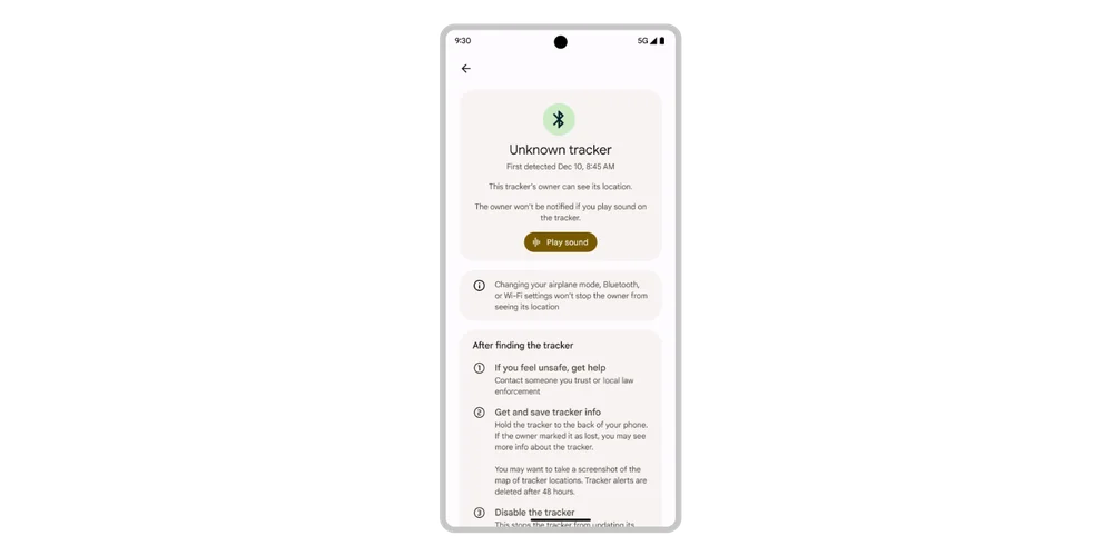 Bluetooth cihazlara karşı yayınlanan uyarılar kapsamında kullanıcılar, Android cihazlarına gelen bir bildirim ile sahibinden ayrılmış ve sizinle seyahat eden tanınmayan bir takip cihazı hakkında uyarılacak. Kullanıcılar bildirime basarak harita görünümünde cihazın kendilerini tam olarak nereden itibaren takip etmekte olduğunu görebilecek.