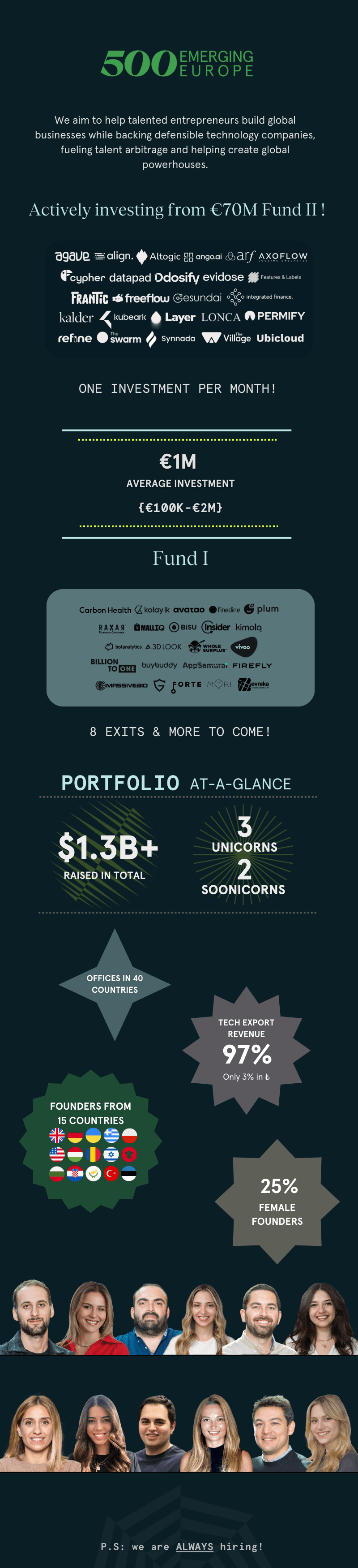 500 Emerging Europe portföyü içinde yer alan girişimlerin bugüne kadar toplamda 1,3 milyar euro yatırım topladığını da ekleyelim. Önümüzdeki 3 yıl boyunca Fund II ile yatırımlarına devam edecek olan 500 Emerging Europe, 40 milyon euroluk yatırım daha yapacak. 500 Emerging Europe yatırımlarını sizlere aktarmaya devam edeceğiz.