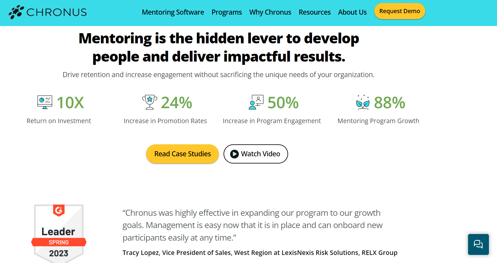 Buna rağmen, platformun hedef belirleme, ilerleme takibi ve analitik dahil olmak üzere gelişmiş özellikleri, onu etkili mentorluk programları oluşturmak isteyen kuruluşlar için verimli bir seçim haline getiriyor. Ayrıca, platformun akıllı eşleştirme algoritması, mentor-danışan çiftlerinin çok uyumlu olmasını sağlıyor. Böylece güçlü ilişkiler kurulmasına, öğrenmenin ve gelişimin yönlendirilmesine yardımcı oluyor. Genel olarak, güçlü özellik seti ve entegrasyon yetenekleri ile Chronus, etkili ve ölçeklenebilir mentorluk programları oluşturmak isteyen kuruluşlar için değerli bir araç.