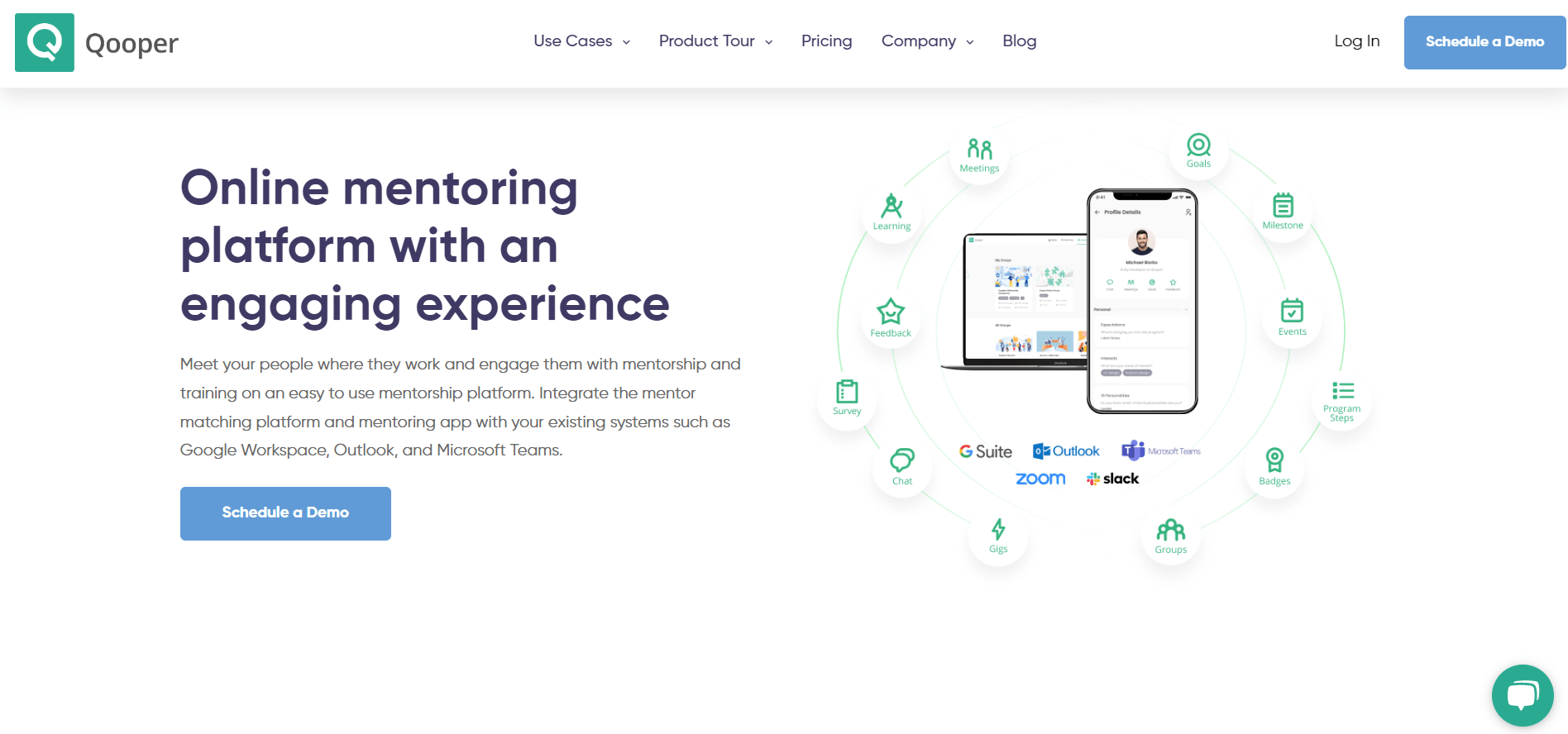 Qooper, mentorluk programlarını kolaylaştırmak için bulut tabanlı bir dijital mentorluk platformu. Kullanıcı dostu arayüzü, mentorların ve danışanların hedef belirlemesi, mesajlaşma, planlama ve ilerleme takibi gibi özelliklerle çevrimiçi iletişim kurmasına ve işbirliği yapmasına olanak tanıyor.