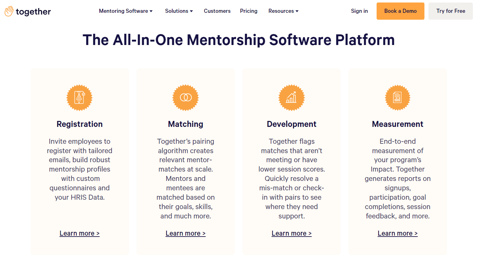 Platform ayrıca hedef belirleme, ilerleme takibi ve içerik paylaşımı dahil olmak üzere herhangi bir kuruluşun ihtiyaçlarına uyacak şekilde özelleştirilebilen özellikler sunuyor. TogetherPlatform'un analiz ve raporlama yetenekleri, katılım seviyeleri, kullanıcı memnuniyeti ve program etkinliği hakkında gerçek zamanlı veriler ve içgörüler sağlayarak mentorluk programlarının başarısını ölçmeyi kolaylaştırıyor. Ek olarak platform, Slack, Zoom ve Salesforce gibi popüler araçlarla entegre olarak mentorluğun mevcut iş akışlarına dahil edilmesini kolaylaştırıyor. Genel olarak, TogetherPlatform'un gelişmiş özellikleri ve özelleştirme seçenekleri, kuruluşlar için onu uygun bir seçim haline getiriyor.