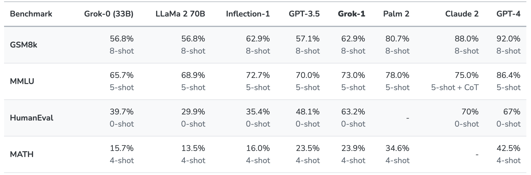 Paylaşılan bilgilere göre Grok-1, Python kod tamamlama görevi HumanEval'da yüzde 63,2 ve multidisipliner çoktan seçmeli sorular sunan MMLU'da yüzde 73 başarı sağladı. Ayrıca aşağıda paylaşılan tabloda da görüleceği üzere Grok-1, ChatGPT-3.5 ve Inflection-1 dahil olmak üzere kendi hesaplama sınıfındaki diğer modelleri geride bıraktı. Bu hesaplamalar arasında MATH ve GSM8k da yer almakta.