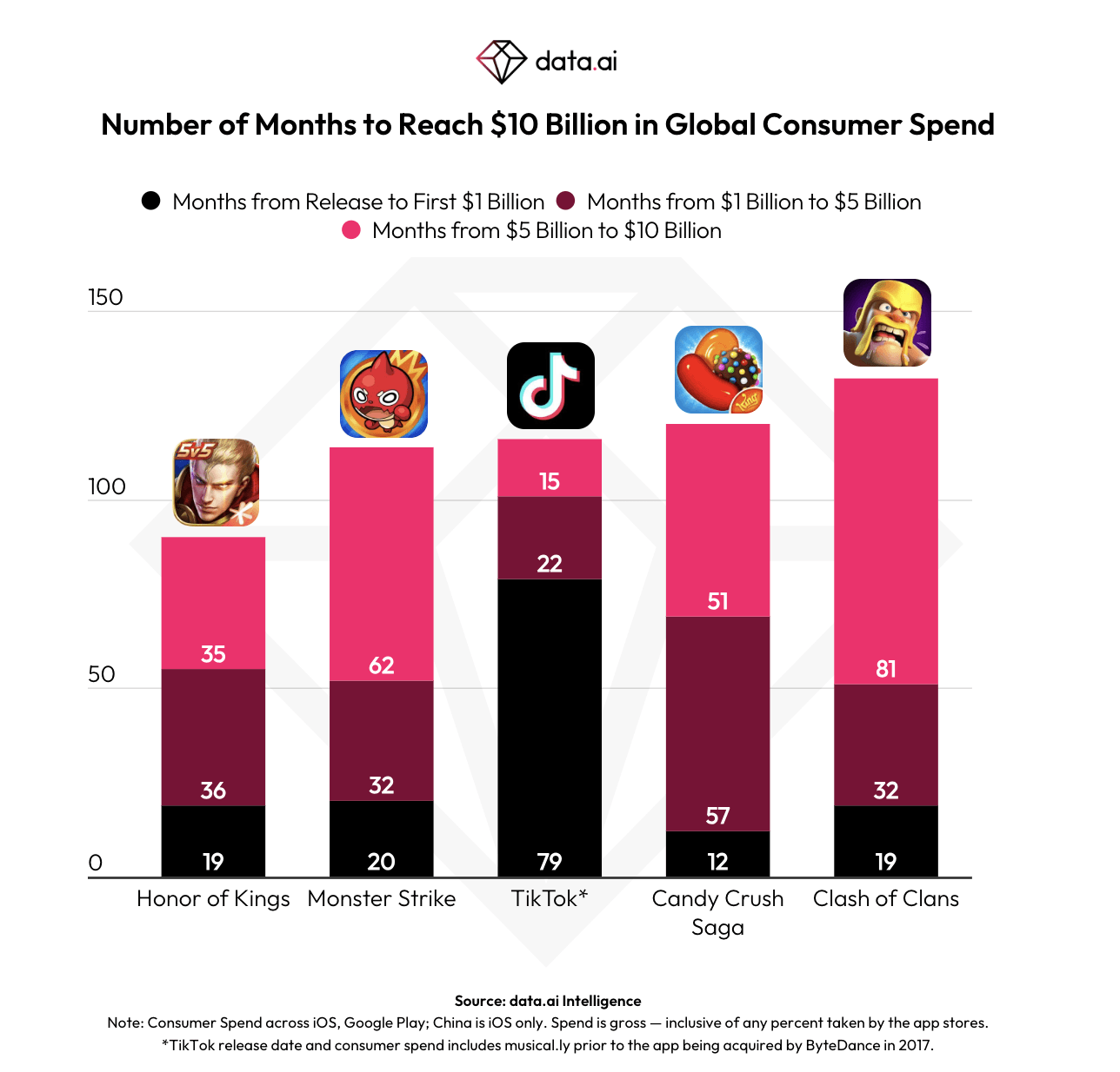 TikTok'un oyun uygulamaları içindeki konumuna baktığımızda, Candy Crush Saga başta olmak üzere oyun kategorisinde en çok kazananların arasına yerleştiğini görüyoruz. Bu alanda tüketici harcaması 12 milyar doları aşan King/Activision Blizzard'dan Candy Crush Saga'yı, 11 milyar dolar tüketici harcamasına sahip Tencent'ten Honor of Kings takip ediyor. XFLAG/Mixi'den Monster Strike 10,6 milyar dolar tüketici harcamasına sahip iken, Supercell'den Clash of Clans ise 10,2 milyar dolar tüketici harcaması ile öne çıkıyor.