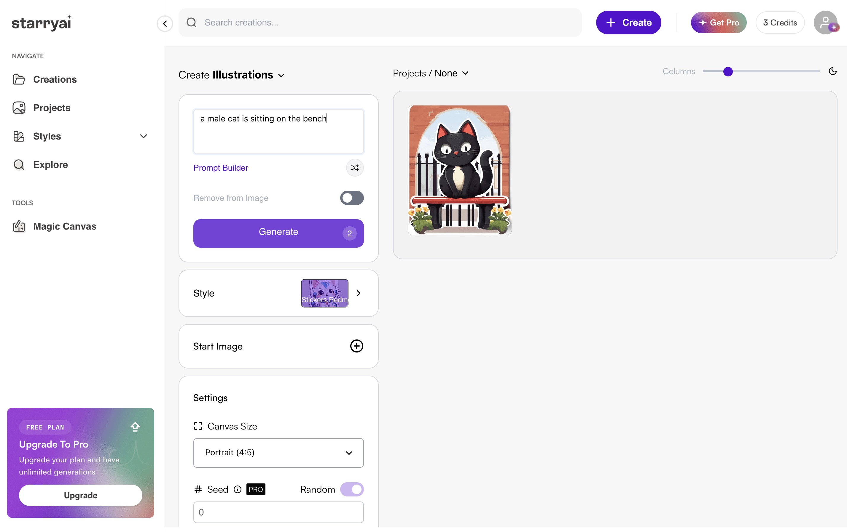 Sadece bir üyelik oluşturarak para vermeden kullanılabilen Starry AI, kullanımı oldukça kolay bir platform. Hesap oluşturduktan sonra yapmanız gereken tek şey çıkan panelde bulunan "My Creations" alanının altındaki (+) işaretine dokunmak. Daha sonra sanat, fotoğraf, illüstrasyon veya diğer stillere göre görsel oluşturabiliyorsunuz. Görsel oluşturmak için bir tanım girmeniz gerekiyor. Örneğin; "a male cat is sitting on the bench" terimi ile çok tatlı bir görsel oluşturdum ve bunu yapmak sadece birkaç saniye sürdü.
