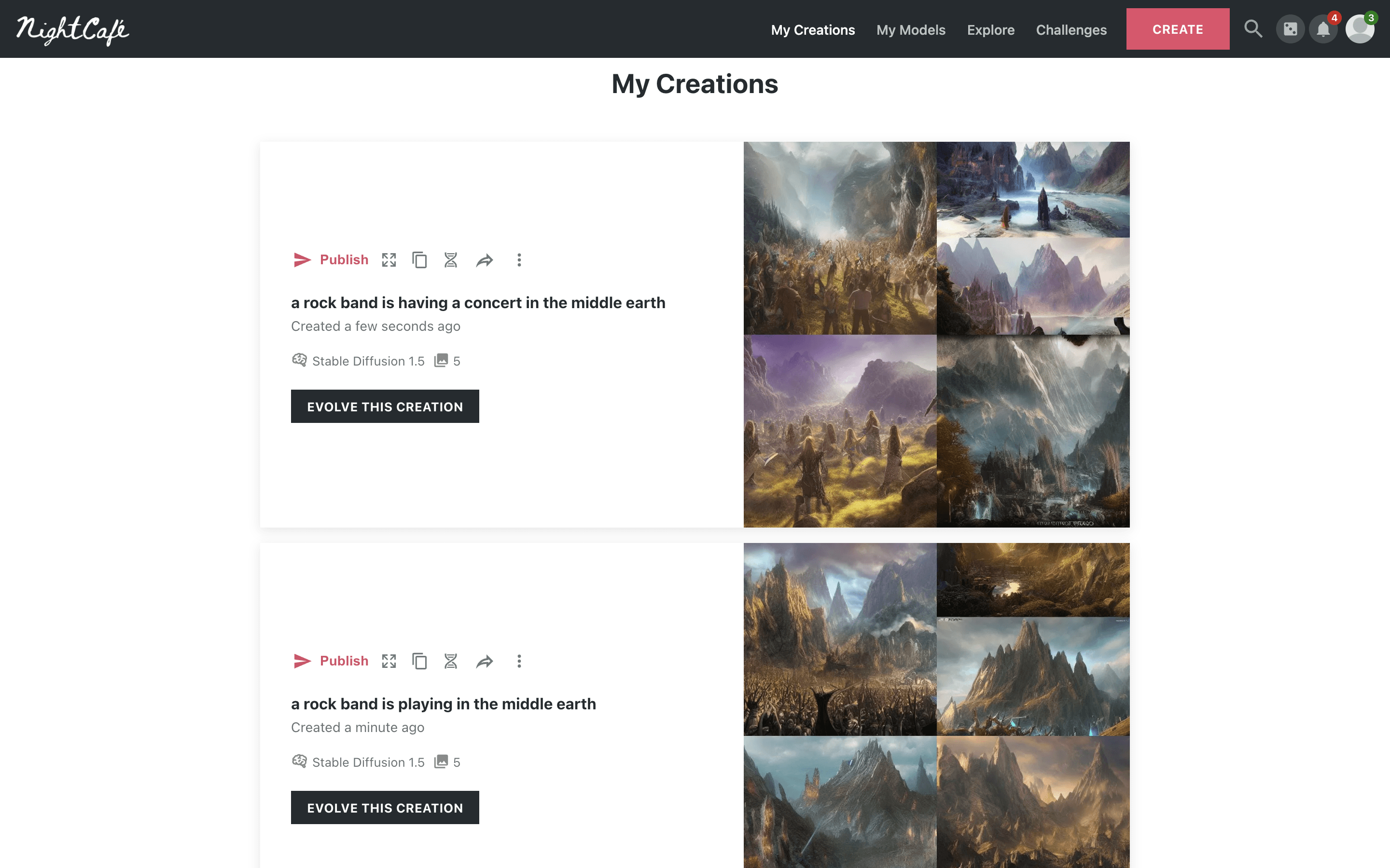 Nightcafe'de oluşturulan görseller tıpkı bilgisayar oyunlarını andırıyor. Benim bu kez talebim "a rock band is having a concert in the middle earth" oldu ve fena sayılmayacak görseller oluşturulduğunu gördüm. Ücretsiz kısımda güzel bir alternatif olabilir.