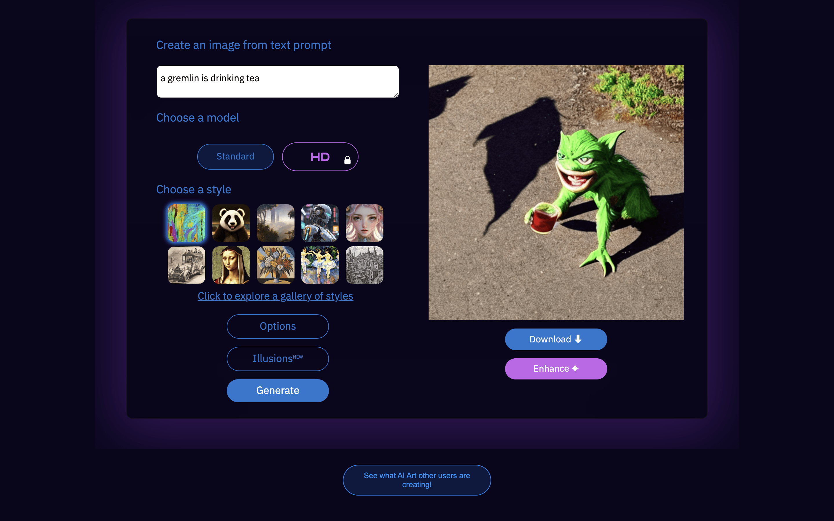 Kullanımı belki de en kolay araçlardan biri. Öncelikle uygulamanın ana sayfasında sizi iki seçenek karşılıyor; "Chat" ve "Image". Görsel oluşturmak için "image" seçeneğini tercih etmeniz gerekiyor. Daha sonra kafanızdaki görsel için bir tanım girmeniz gerekiyor. Ben bu kez, "a gremlin is drinking tea" tanımını kullanarak bir görsel oluşturdum. Mükemmel olmasa da doğru bir görsel oluşturdu. Bu arada DeepAI da birkaç görseli üyeliksiz oluşturabiliyorsunuz ama daha fazla görsel oluşturmak isterseniz bir hesap oluşturmanız gerekiyor. Eğer HD formatta görsel istemiyorsanız herhangi bir ücret vermeniz de gerekmiyor.