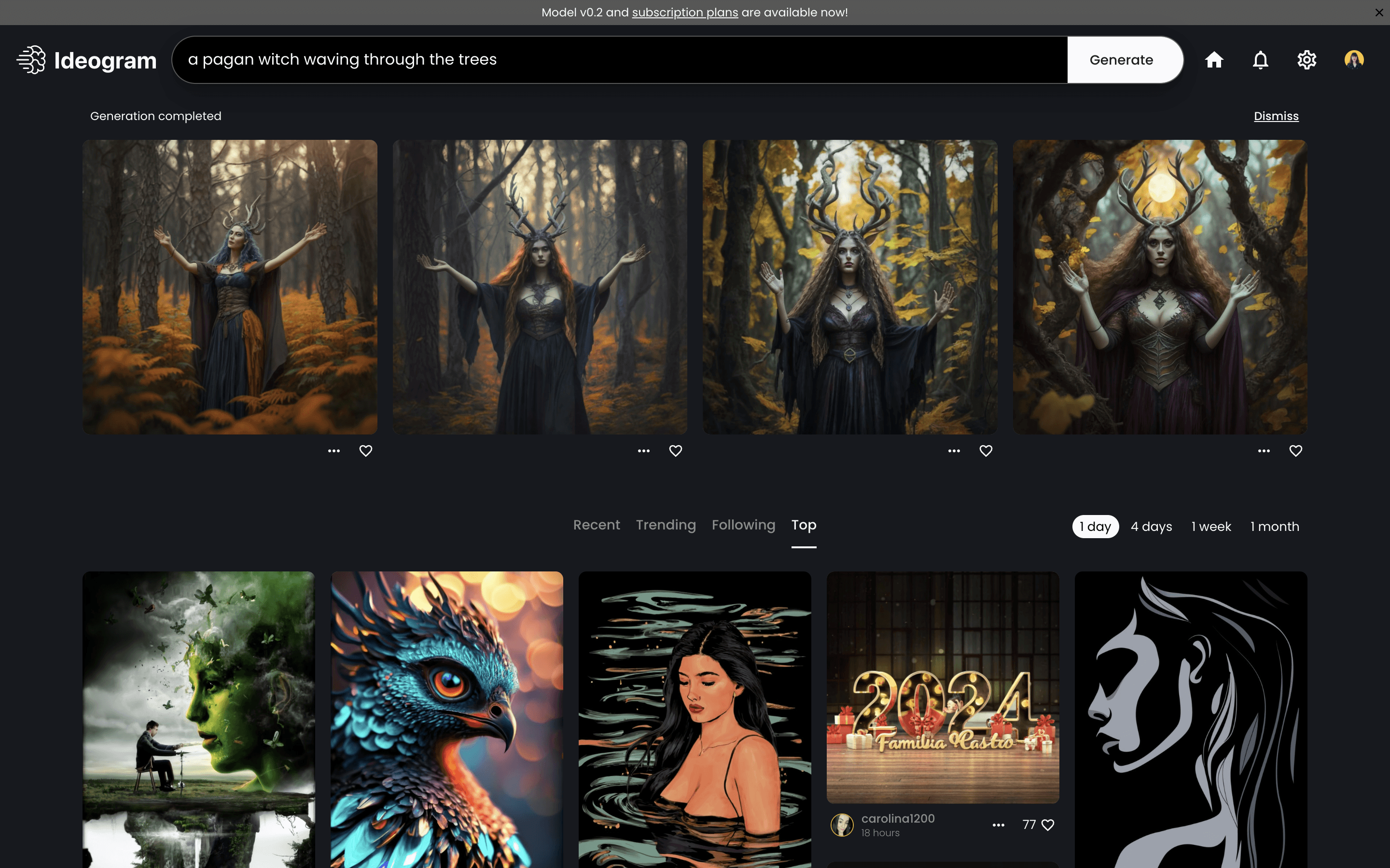 Ideogram'i kullanmak için öncelikle bir profil oluşturmanız gerekiyor, akabinde giriş yaptığınızda direkt olarak bir komut (prompt) vererek dilediğiniz görselin saniyeler içinde oluşmasını izliyorsunuz. Ben bu kez "a pagan witch waving through the trees" komutunu kullandım ve gerçekten oldukça başarılı görsellerin oluşturulduğunu gördüm, hatta görseller beklediğimden daha başarılı oldu.