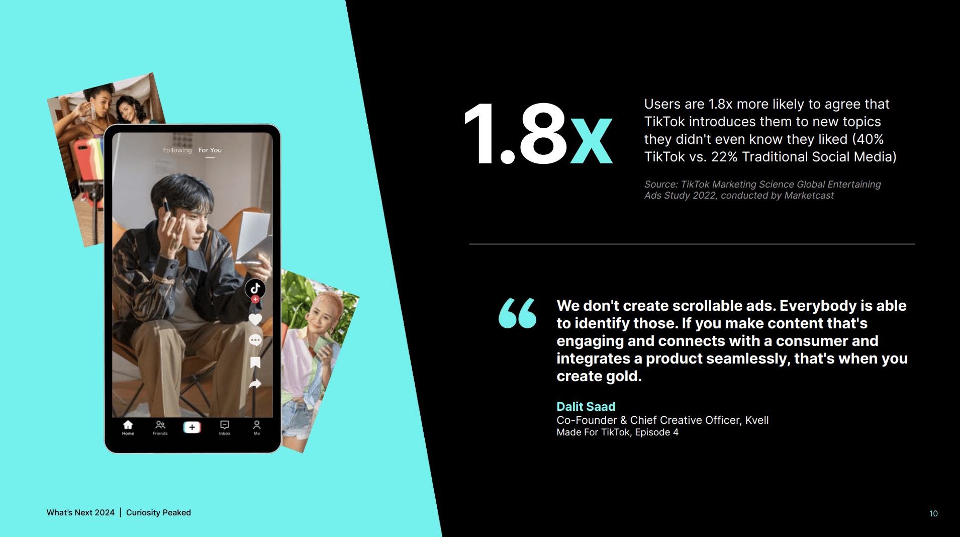 Rapora göre kullanıcılarda merak uyandırmayı hedefleyen reklamlar, 1,4 kat daha uzun süre izleniyor. Türkiye'ye bakıldığındaysa kullanıcıların yüzde 80'i, TikTok'un satın almak istedikleri şeyleri gösteren bir platform olduğunu ve bu nedenle başka herhangi bir platformdan ziyade TikTok'ta reklam görmeye açık olduklarını belirtiyor.
