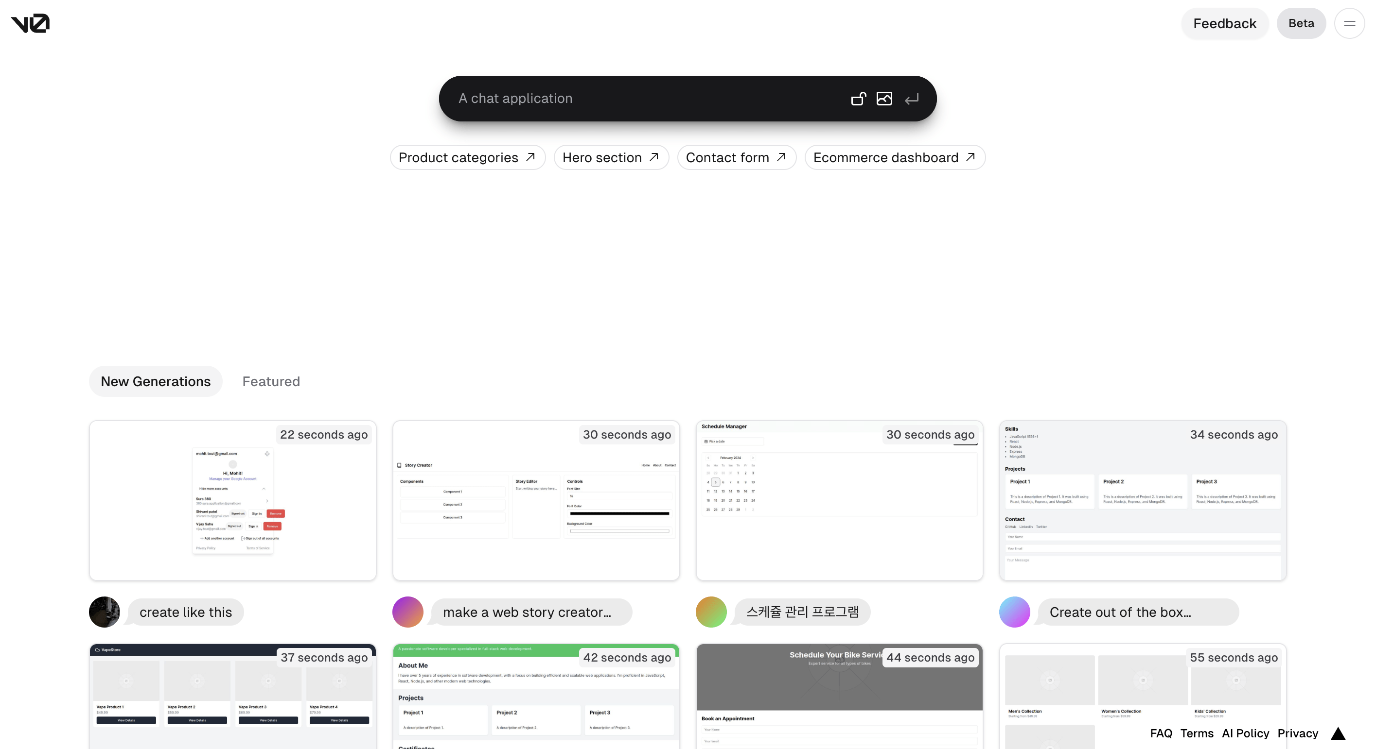 Vercel Labs tarafından hayata geçirilen v0.dev, üretimsel yapay zeka destekli bir kullanıcı arayüzü sistemi. Beta sürümünde olan v0, metinsel komutlara dayalı kod üretimi için yapay zeka modellerini kullanıyor. v0.dev, Shadcn UI ve Tailwind CSS tabanlı React kodu oluşturuyor. Bu kodları kopyala - yapıştır yöntemiyle kullanmanız sağlanıyor.