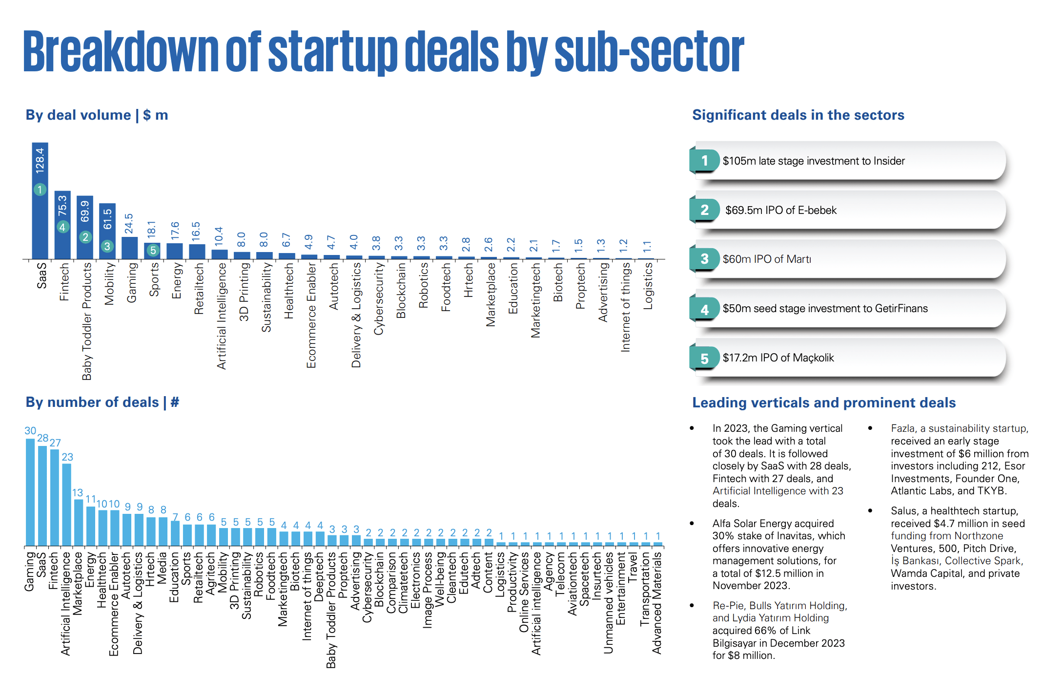 Raporda paylaşılan verilere göre; dünya genelindeki trende paralel olarak, Türkiye'de de benzer bir tablo gözlemleniyor. Toplam yatırım miktarında işlem hacmi bazında düşüşe karşın, Türkiye'deki startup yatırımları toplam işlem sayısı bakımından 2022 yılına kıyasla daha yüksek seviyelere ulaştı. 2022 yılında toplam 277 işlem gerçekleşirken, 2023 yılında toplam 297 işlem gerçekleşti. Türkiye'de toplam işlem hacmi 2022'de 1,84 milyar dolar iken, 2023 yılında 497 milyon dolar oldu.