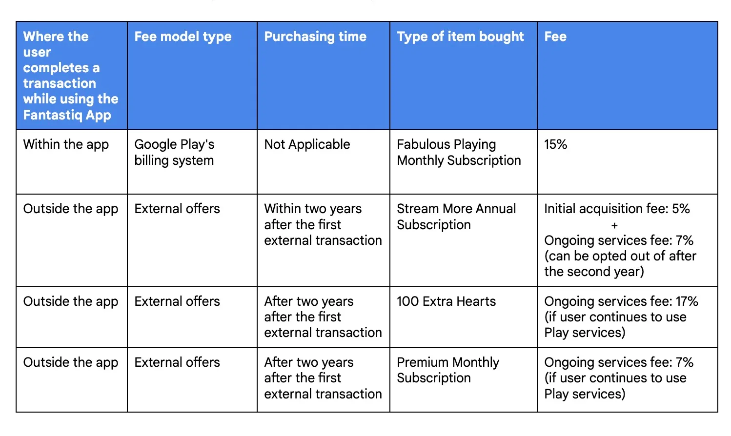 Google, bundan böyle External Offers programı işlemlerine eşlik eden iki ücret olacağını söylüyor. Bunlardan ilki yygulama içi satın alımlar için yüzde 10 veya iki yıllık abonelikler için yüzde 5 olan ilk satın alma ücreti. Google, bu ücretin Play Store aracılığıyla ilk kullanıcı edinimini kolaylaştırmada Play'in sağladığı değeri temsil ettiğini söylüyor. Diğer ise uygulama içi satın alımlar için yüzde 17 veya abonelikler için yüzde 7 olan devam eden hizmetler ücreti.