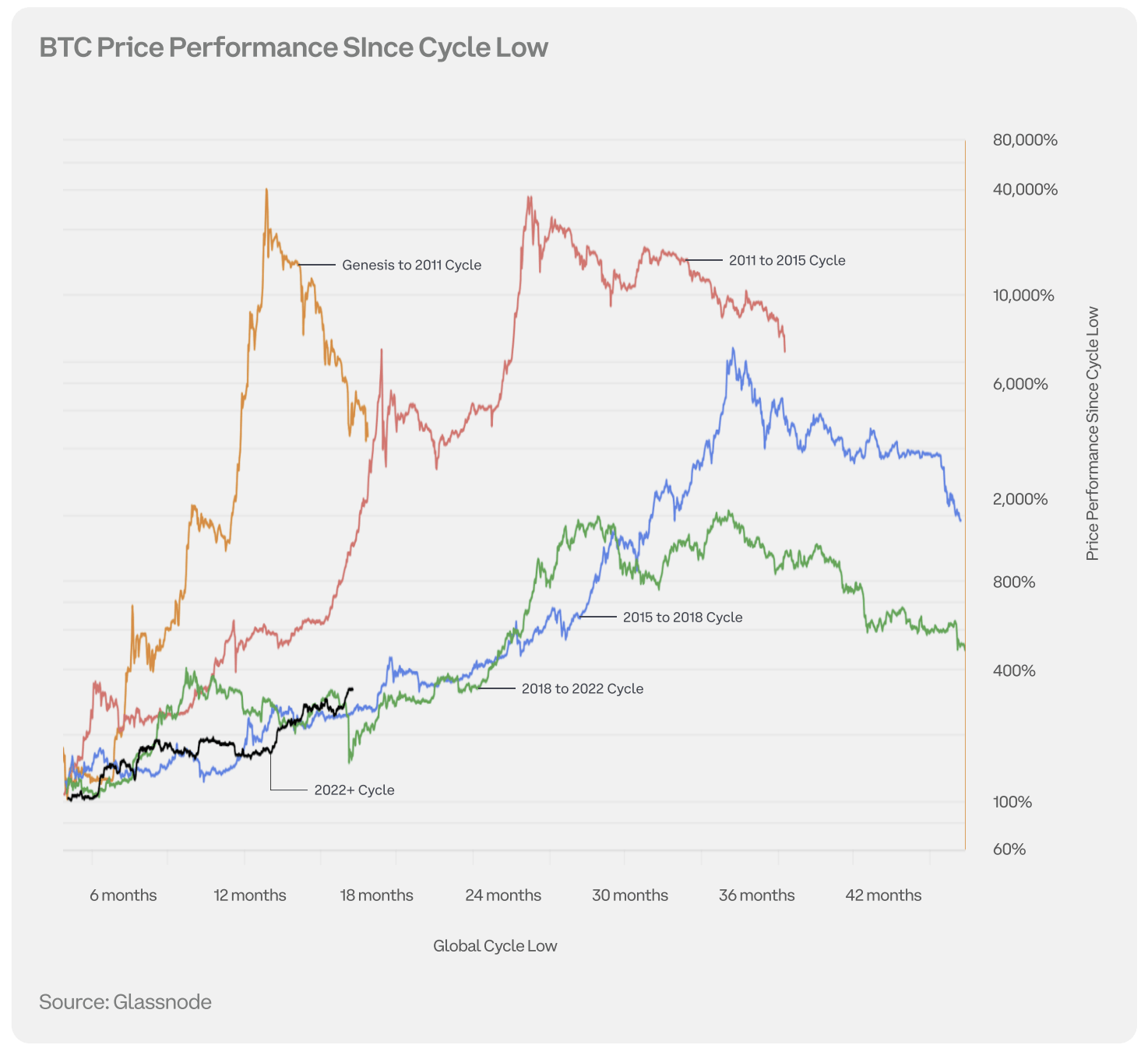 Coinbase raporunda zincir üzerindeki ölçümlere de yer veriliyor. Bitcoin'in 2009 yılında ortaya çıkışından bu yana dört piyasa döngüsünü tamamladığına dikkat çeken rapor, mevcut döngünün en çok 2018-2022 yılları arasındaki döneme benzediğini belirtiyor. Bu dönemde Bitcoin'in döngünün en düşük seviyesinden yüzde 500 değer kazandığını belirtmekte fayda var.