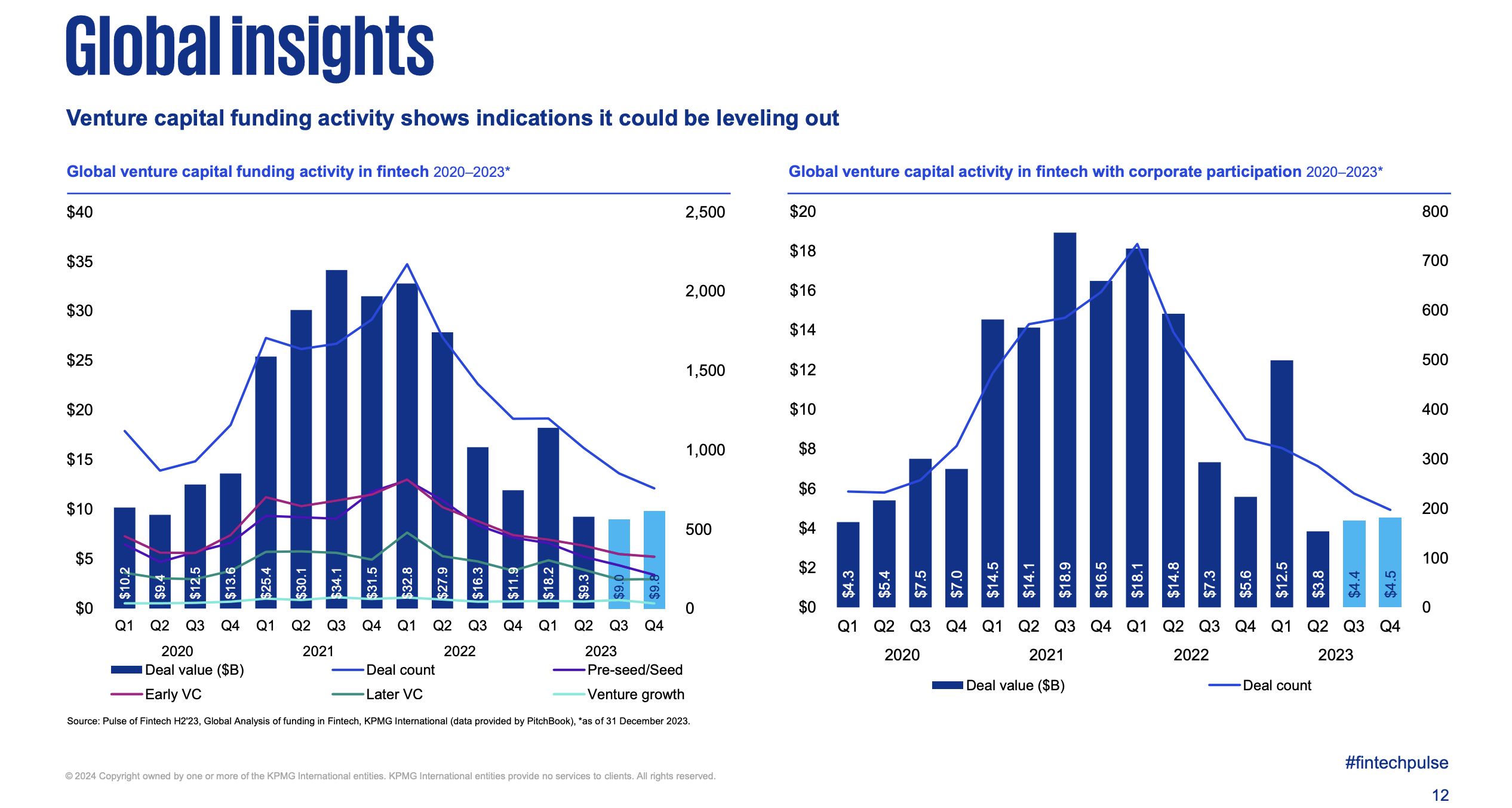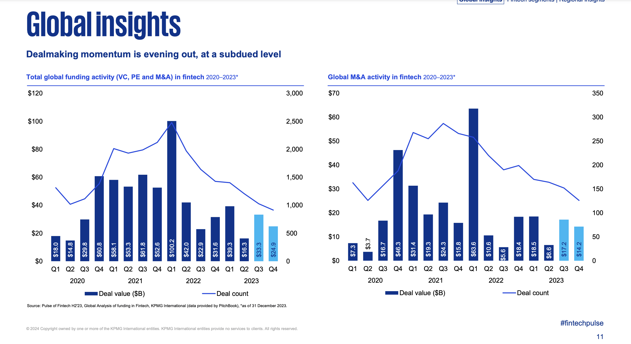 KPMG'nin küresel çapta fintech'lere yapılan yatırımları incelediği Pulse of Fintech raporuna göre; 2023 yılı, hem toplam fintech yatırımı hem de fintech anlaşmalarının sayısı bakımından 2017'den bu yana en zayıf sonuçların görüldü yıl oldu. Fintech'lere yapılan yatırım miktarı 113,7 milyar dolara, anlaşma sayısı ise 4 bin 547'ye geriledi.