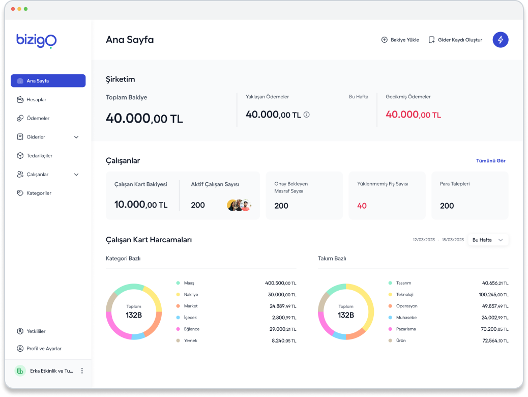 Bizigo ile şirketler çalışanların harcamalarını takip ederken, masraf onay süreçlerini hızlı ve otomatik bir şekilde tamamlayabiliyor. Kartlar çalışanlara anında tanımlanırken, bakiyesi de hızlıca yükleniyor. Çalışan kartları masraf süreçlerine entegre olduğu için giderler şirket kartları ile ödeniyor. Bununla beraber onay süreci de anında başlatılıyor.