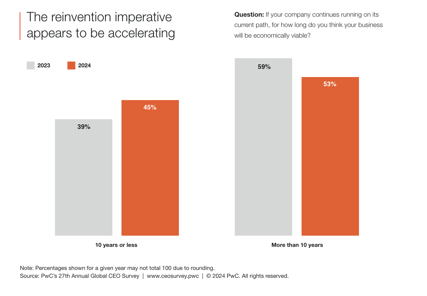 PwC'nin 27'nci Yıllık CEO Anketi yani PwC’s 27th Annual Global CEO Survey'e göre, CEO'ların yüzde 45'i önümüzdeki on yıl içinde mevcut iş modellerinin ayakta kalamayacağını düşünüyor.