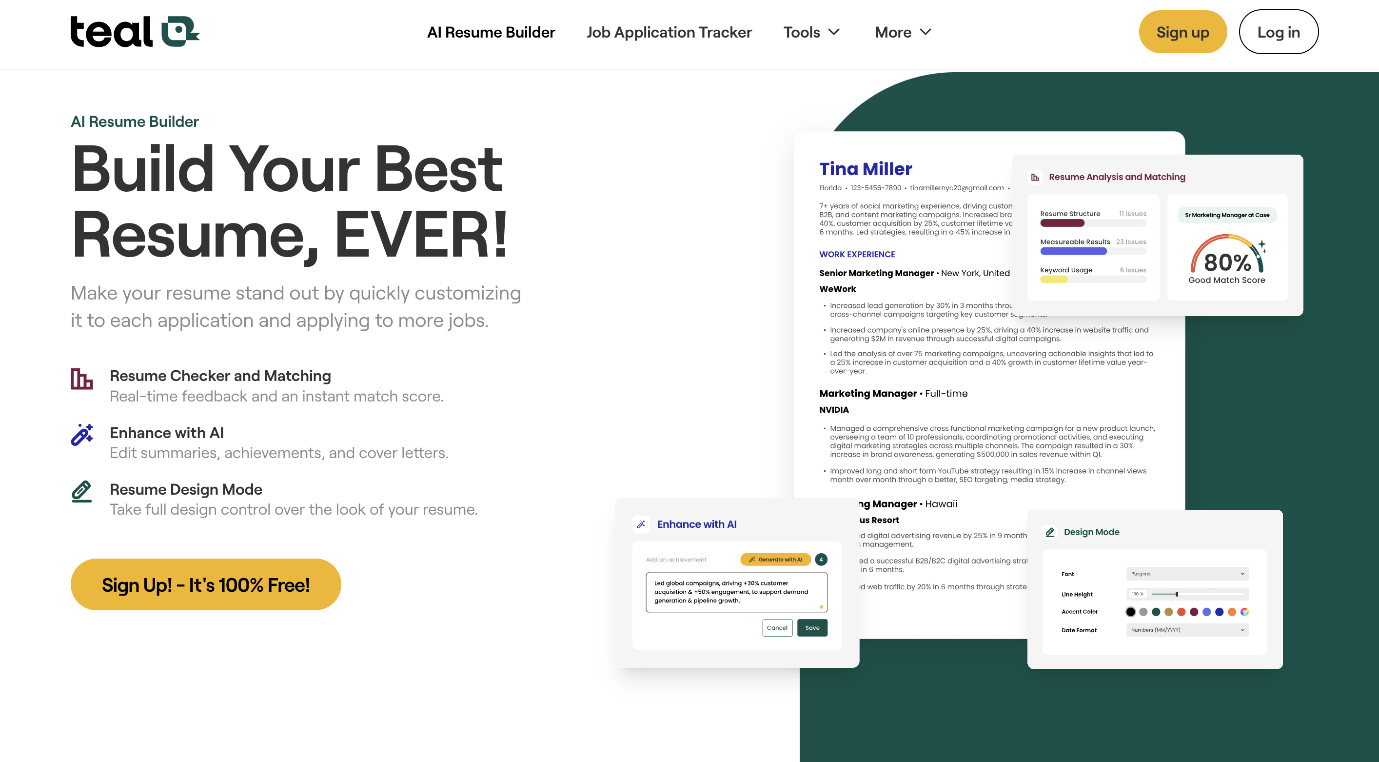 Teal, özgeçmişlerini aday takip sistemleri (ATS) için optimize ettiğine dair bir bilgi vermiyor, ancak metin tabanlı şablonlardan oluşan iyi bir koleksiyona sahip. İstek listenize iş ekledikçe, mevcut özgeçmişinizin iş tanımıyla ne kadar eşleştiğine yönelik puan alabilirsiniz. Böylece özgeçmişinizde, hedeflediğiniz şirketlerin aradıklarına göre iş geçmişinizin bazı bölümlerini gösterebilir veya kapatabilirsiniz. Teal'ın Chrome uzantısı da mevcut.