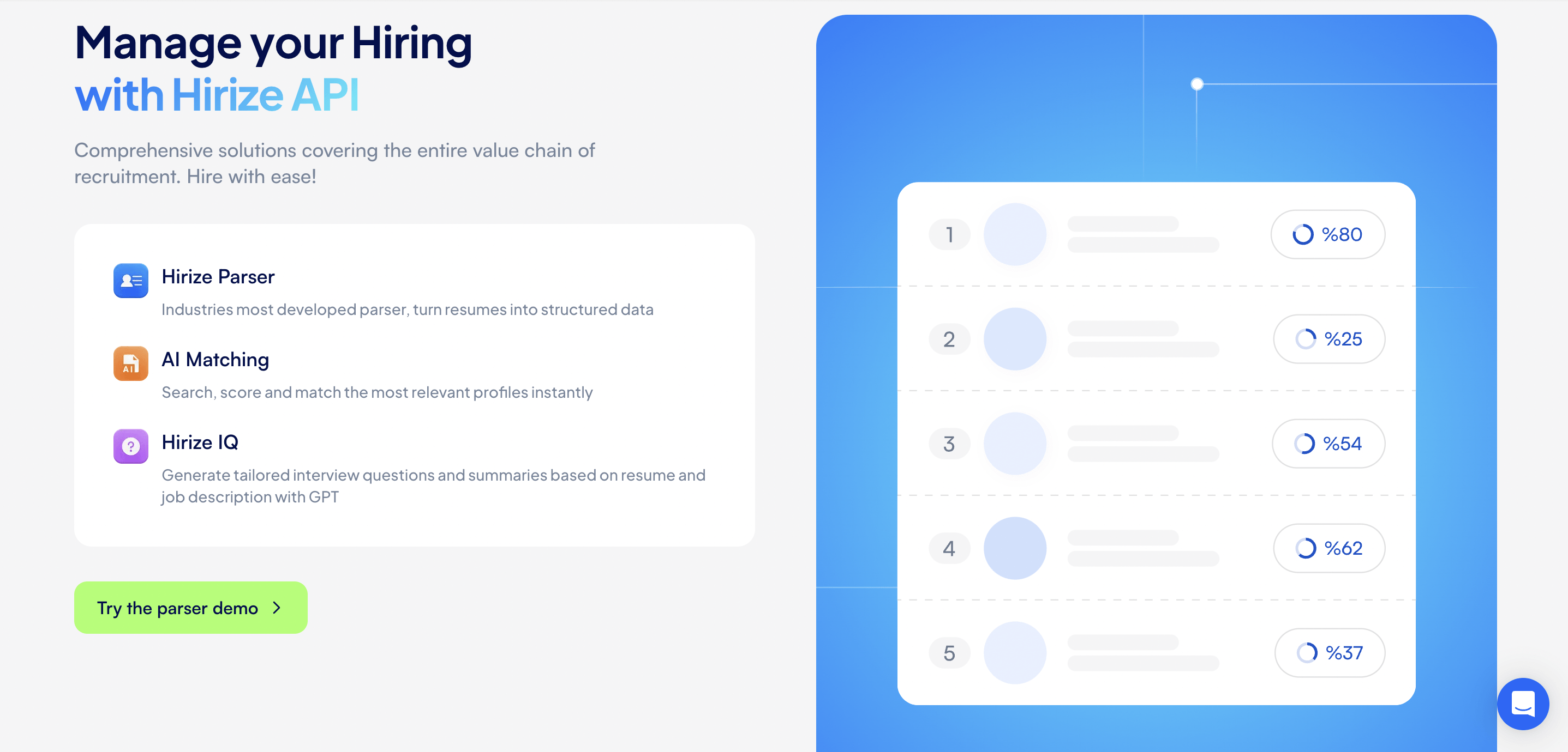 Hirize'ın yüksek doğruluk oranına sahip gelişmiş API'leri, karmaşık belgeleri anlamak ve kullanmak için gerekli net içgörüler sağlıyor. Bu teknoloji, işe alım süreçlerini yöneten aday takip sistemi (ATS) gibi SaaS platformları içinde kullanılarak daha doğru kararlar alınmasına yardımcı oluyor. Aynı şekilde şirketler Hirize'ın teknolojisinden faydalanarak muhasebe yazılımlarında veri işleme süreçlerini otomatikleştirirken, sağlık sektöründe hasta kayıt sistemlerini iyileştirebilir.