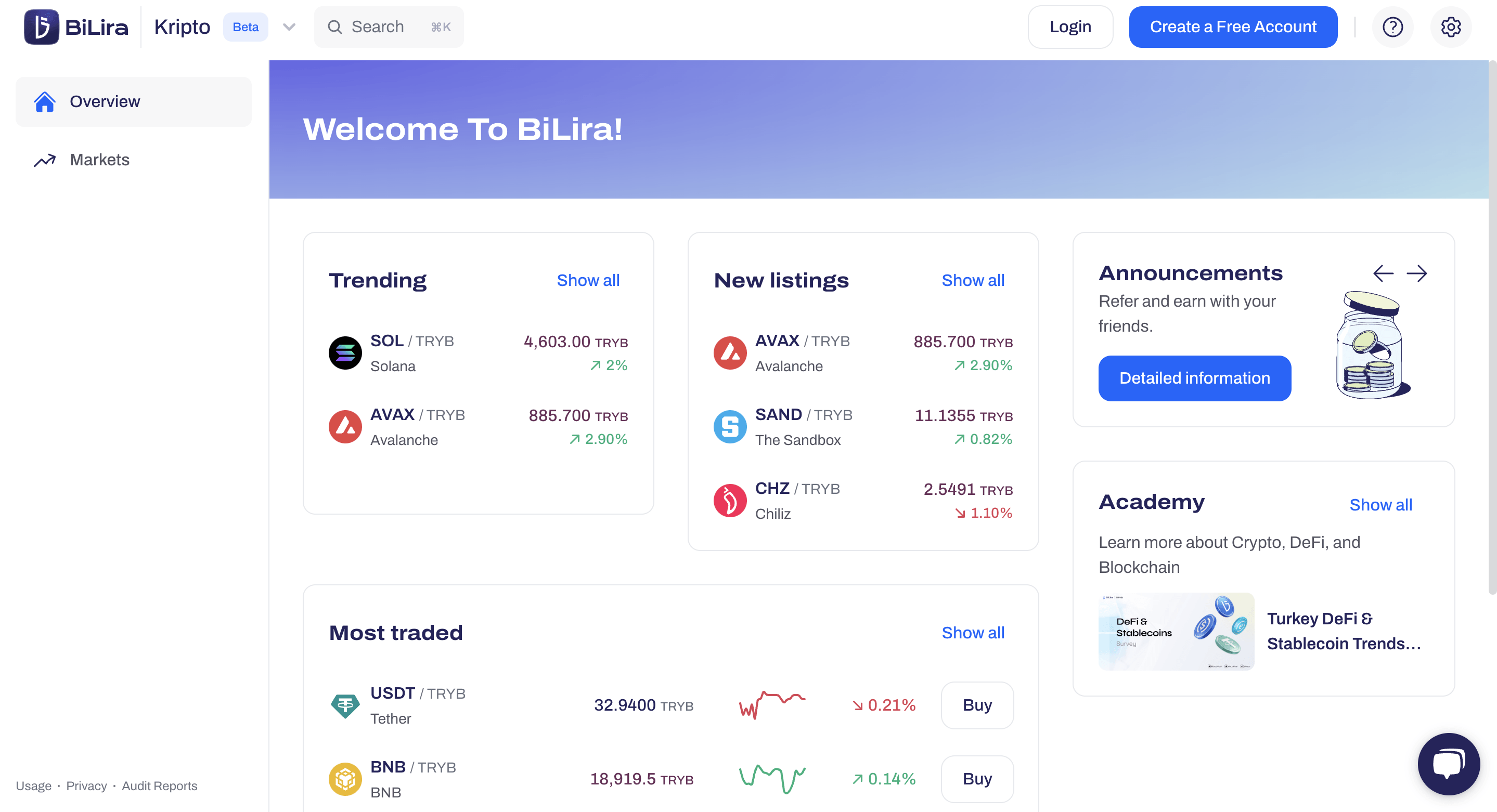 Güncelleme: BiLira, Beta sürümünün ardından 2024'ün Eylül ayında BiLira Kripto platformu yayına aldığını duyurdu.