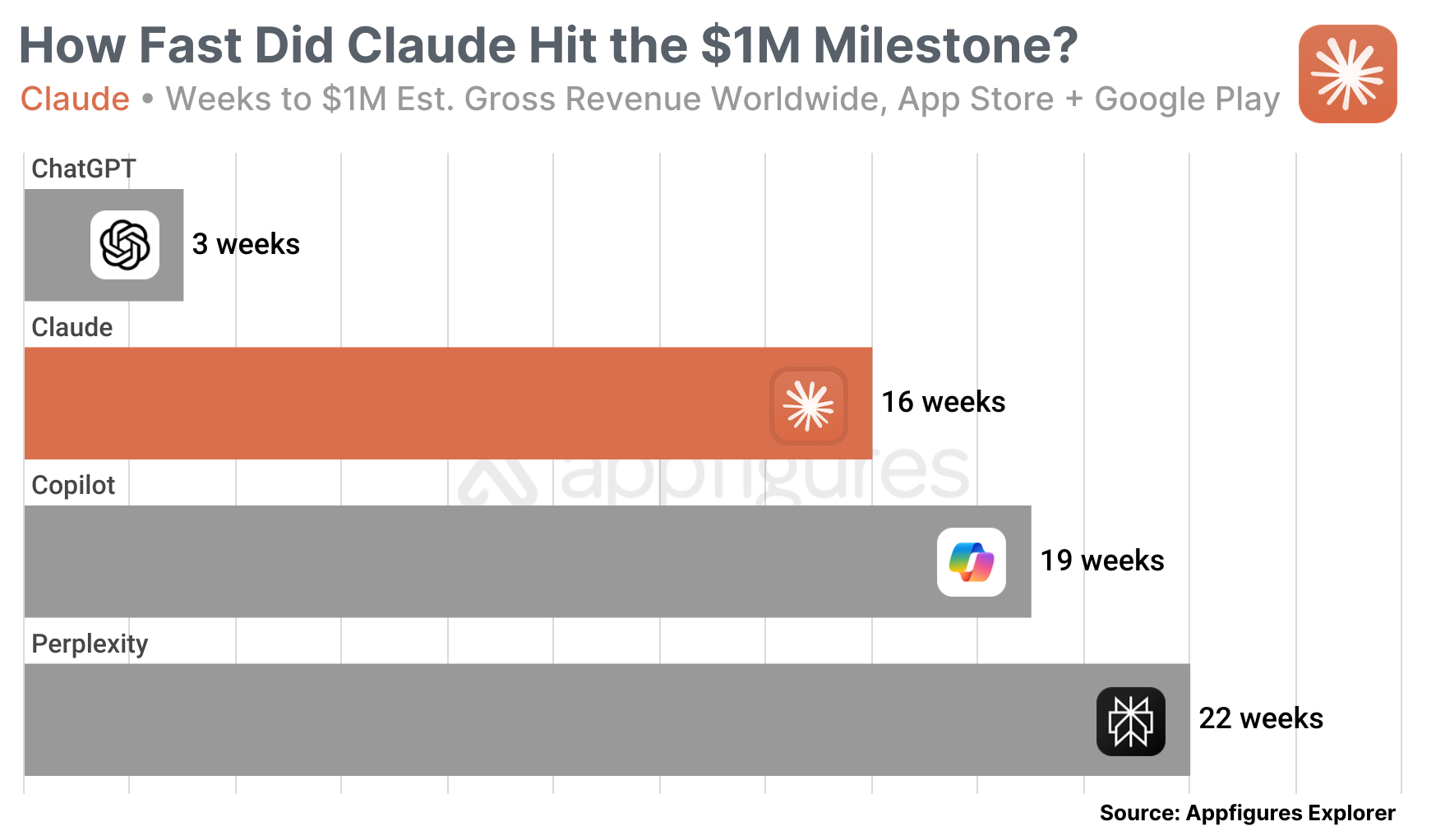 Bu arada şuna detaya da değinmek gerek; Claude, ChatGPT'nin çok gerisinde kalsa da 1 milyon dolara ulaşması sırasıyla 19 hafta ve 22 hafta süren Microsoft'un Copilot ve Perplexity uygulamalarının önünde yer aldı. Bu da aslında oldukça önemli bir gelişme.