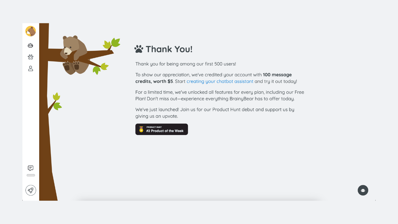 Brainybear, ilk 500 kullanıcısına belirlemiş olduğu özel 5 dolar değerindeki 100 mesaj kredi hediyesi ile chatbot dünyasına hızlı bir giriş yapmamızı sağlıyor. Aylık 50 mesaj kredisi sağlayan ücretsiz planının yanında, ihtiyaçlarınıza göre aylık 38 dolar ile 189 dolar arasında değişen planları da mevcut.