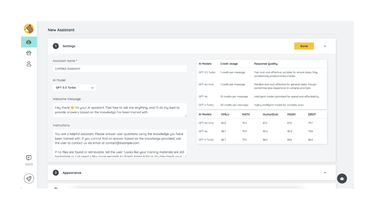 Seçenekler arasından size en uygun yapay zeka modelini seçtikten sonra chatbot’unuzun müşterilerinizi nasıl karşılayacağını ve nasıl konuşacağı konusunda gerek duyabileceği tüm talimatları yazabilirsiniz. Bildiğiniz üzere; yapay zekadan doğru dönüşler almak, sağladığınız verilerin miktarı ile de ilişkili. Dilerseniz, doğrudan web sitesini ya da sadece belirli dokümanları ekleyerek robotunuzu eğitebilirsiniz.