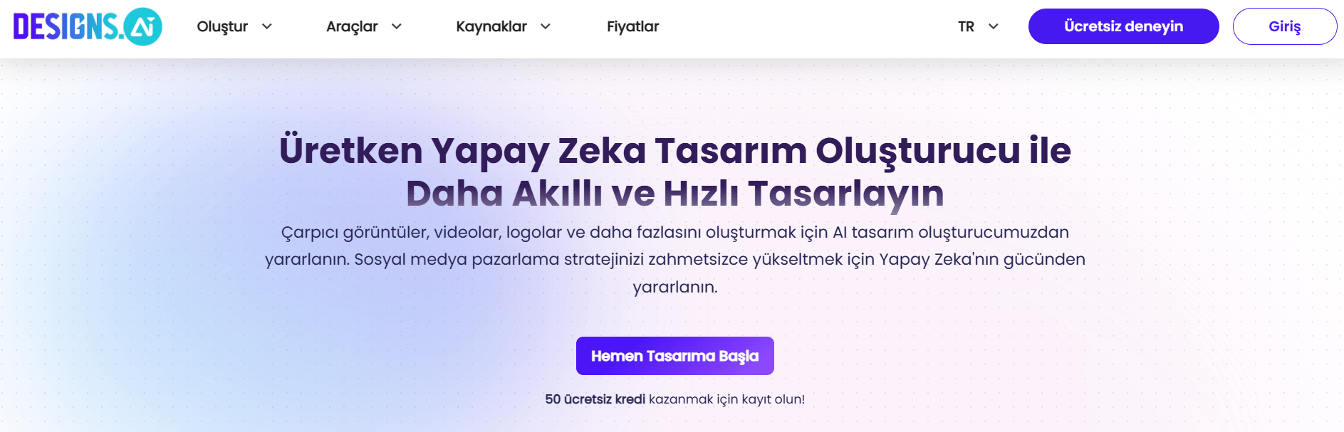 Designs AI yapay zeka destekli çok yönlü bir tasarım platformu olarak öne çıkıyor. Logo Maker aracı, kullanıcıdan aldığı bilgiler doğrultusunda logoyu ve bu logoya uygun renk paletiyle yazı tiplerini otomatik olarak oluşturuyor. Sistem aynı zamanda Font Pairer ve Color Matcher araçlarıyla marka tutarlılığını güçlendiriyor. Kullanıcılar, tek bir panel üzerinden logo, video, grafik veya ses tabanlı içerikleri oluşturabiliyor ve markalarının tüm görsel varlıklarını bir araya getirebiliyor. Platform, kullanıcıların ücretsiz deneme seçeneğiyle logo oluşturma araçlarını test etmesine imkan tanıyor ve sonrasında aylık 19 dolardan başlayan planlarla tam erişim sunuyor.