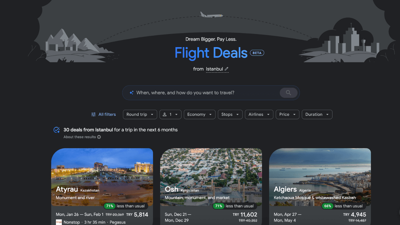 Bugüne kadar yalnızca ABD, Kanada ve Hindistan’da kullanılabilen yapay zeka destekli Flight Deals artık 200’den fazla ülke ve bölgeye, 60’tan fazla dil desteğiyle yayılıyor. Kullanıcılar yalnızca “ne zaman, nereye, nasıl” seyahat etmek istediklerini tarif ediyor; Google da en uygun rotaları ve fiyatları otomatik olarak listeliyor.