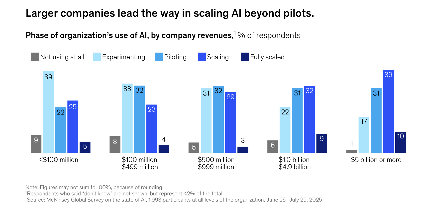 Araştırmaya göre katılımcıların yüzde 88’i, çalıştıkları kurumda en az bir iş fonksiyonunda yapay zekanın düzenli olarak kullanıldığını söylüyor. Bir önceki yıl bu oran yüzde 78 iken bugün neredeyse her on şirketten dokuzu yapay zeka kullanıyor diyebiliriz. Buna rağmen şirketlerin yaklaşık üçte ikisi hala deneme ve pilot aşamasında, sadece yaklaşık üçte birlik bir grup yapay zeka programlarını kurum genelinde ölçeklediğini belirtiyor.