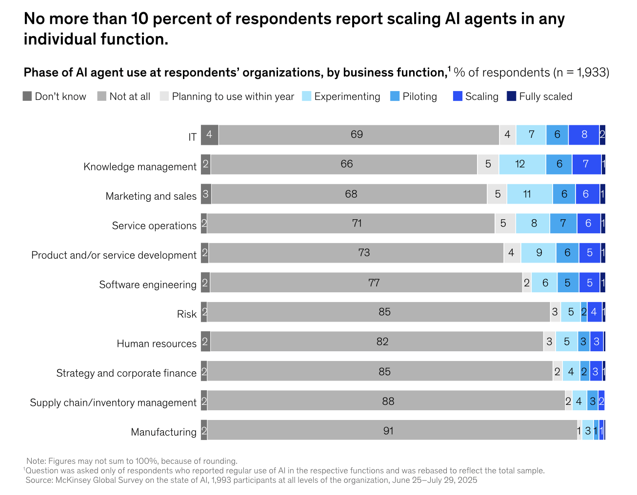 Buna karşın ajanik yapay zekanın kurum içi dağılımı henüz dar. McKinsey, hiçbir iş fonksiyonunda katılımcıların yüzde 10’undan fazlasının ajanları ölçeklendirmediğini belirtiyor. Bugün ajanların en çok görüldüğü alanlar IT ve bilgi yönetimi, kullanımın en yoğun olduğu sektörler ise teknoloji, medya, telekomünikasyon ve sağlık olarak öne çıkıyor.