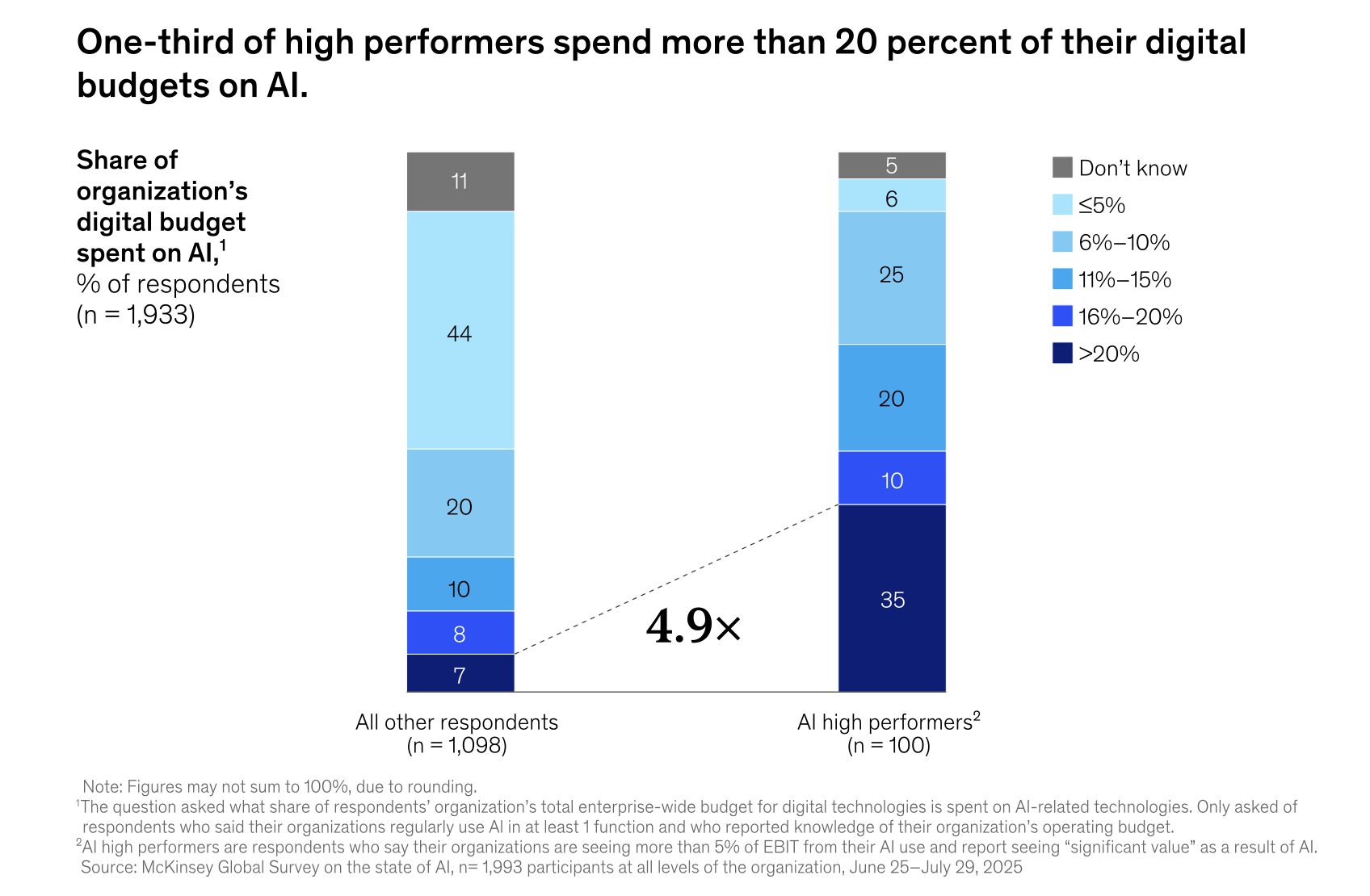 Yönetim tarafında yüksek performanslı şirketlerde üst düzey yöneticilerin yapay zeka girişimlerine sponsor olduğu, model çıktılarının nerede mutlaka insan kontrolünden geçmesi gerektiğine dair süreçlerin tanımlandığı ve dijital bütçenin ciddi bir bölümünün yapay zeka projelerine ayrıldığı belirtiliyor. Bu grupta şirketlerin üçte birinden fazlası dijital bütçesinin yüzde 20’sinden fazlasını yapay zekaya ayırıyor.