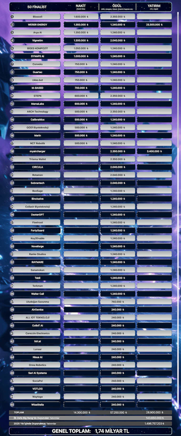 Big Bang Startup Challenge 2025'te toplamda 1.74 milyar TL’yi aşan ödül, nakit ve yatırım açıklandı. Etkinlikte öne çıkan girişimler arasında Bloocell, Werer Energy, Arya AI, Vignetim ve Biges Kompozit ilk 5'te yer aldı. İTÜ Çekirdek girişimleri arasında ise Laska Teknoloji ve Pardon AI sırasıyla 800 bin ve 1,5 milyon dolar yatırım alarak dikkat çekti.