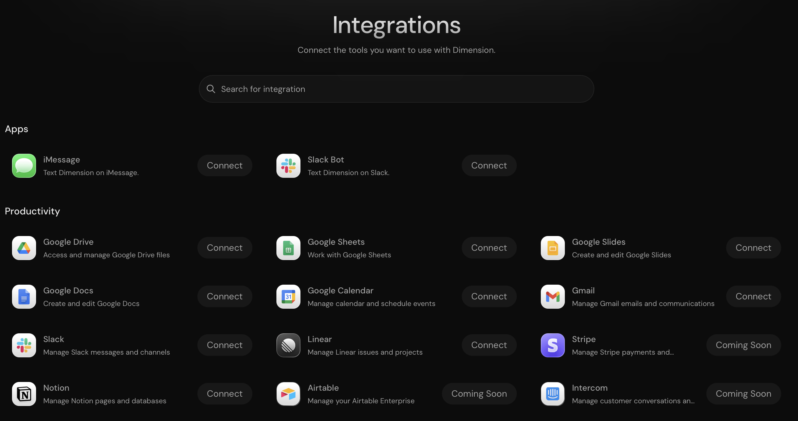Dimension, entegrasyon tarafında oldukça geniş bir ekosistemi destekliyor. GitHub ve Linear üzerinden kod ve issue yönetimi, Slack ile ekip iletişimi, Gmail ile gelen kutusu trafiği, Google Calendar ile toplantı takibi ve Google Drive, Docs, Sheets ile döküman tarafı tek bağlam içinde birleşiyor. Ayrıca Notion, Vercel, Google Meet, Google Workspace, Stripe, Microsoft Teams ve Salesforce gibi araçlarla da entegrasyon sunuluyor. Bu yapı sayesinde örneğin Vercel deploy’larını izleyip hata olduğunda Slack kanalına otomatik bildirim gönderen, müşteri e-postalarından Linear issue’ları açan veya Notion sayfalarından ürün değişikliklerini çekip changelog oluşturan senaryolar kurulabiliyor.