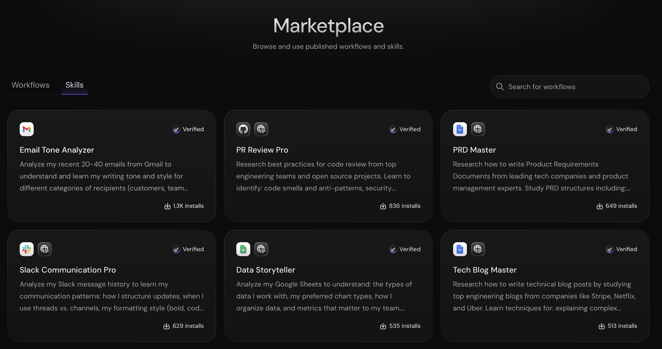 Platformun marketplace tarafında hazır workflow ve yetenek galerisi bulunuyor. Dimension, kullanıcıların sıfırdan akış kurmakla zaman kaybetmemesi için toplantı sonrası özetleme, yatırımcı güncellemesi hazırlama, haftalık sprint raporu çıkarma, müşteri geri bildirimini gruplama gibi senaryoları paketlenmiş iş akışları olarak sunuyor. Kullanıcılar bu hazır akışları kendi entegrasyonlarıyla eşleştirip küçük düzenlemelerle devreye alabiliyor.