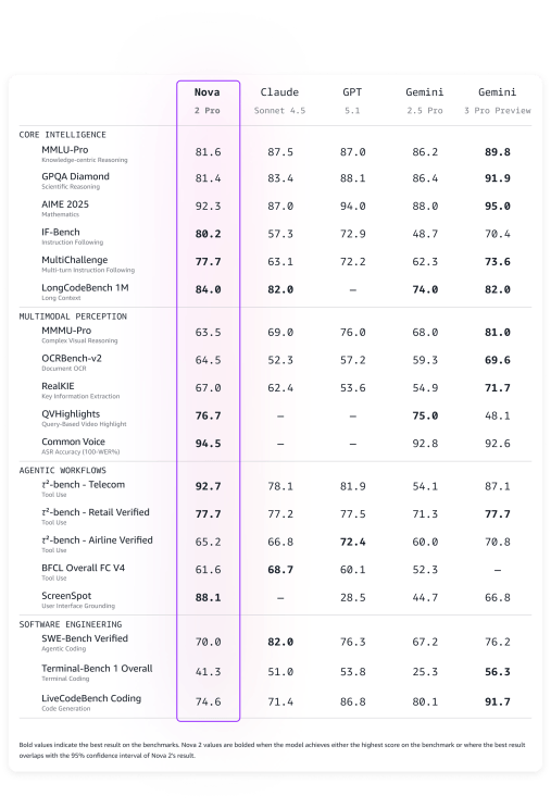 Nova 2 Pro, Amazon'un en gelişmiş "reasoning" modeli olarak konumlanıyor. Karmaşık kodlama, uzun vadeli planlama ve çok adımlı görevler gibi yüksek doğruluk gerektiren alanlarda kullanılması hedefleniyor. Claude Sonnet 4.5, GPT-5.1 ve Gemini 3 Pro gibi modellerle rekabet eden Nova 2 Pro, gelişmiş çoklu doküman analizi ve video yorumlama yetenekleriyle öne çıkıyor.