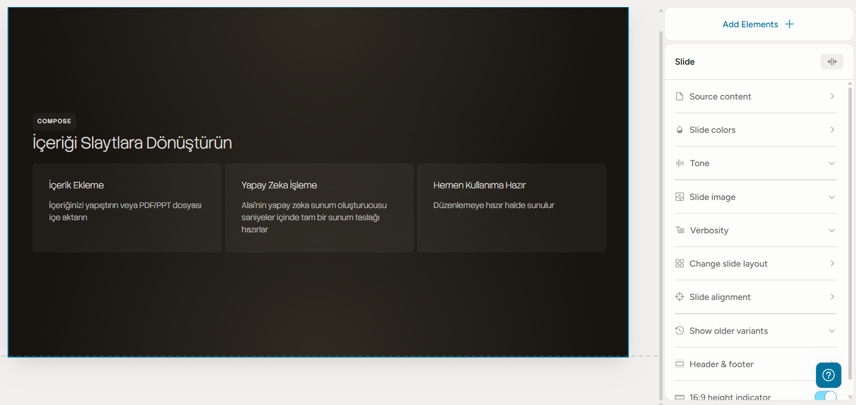 Alai, içerik ve fikirleri hızla sunuma dönüştürmeyi hedefleyen yapay zeka destekli bir platform olarak konumlanıyor. Kullanıcı, metnini doğrudan yapıştırarak ya da mevcut dosyalarını içeri aktararak kısa sürede sunum taslağı oluşturuyor. Ardından aynı çalışma alanında içeriği ve tasarımı birlikte ilerletiyor. Alai, sunumların yalnızca görsel değil, aynı zamanda anlatının daha ikna edici ve düzenli görünmesine odaklanıyor.