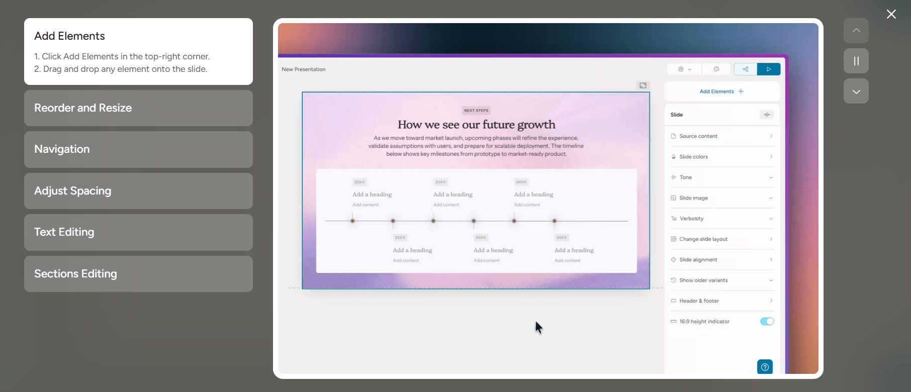 Ürünün temel yaklaşımı, tek seferlik çıktı üretmek yerine düzenleme sürecini hızlandırmak üzerine kurulu. Platform, her slayt için birden fazla güçlü alternatif üretmesiyle öne çıkıyor ve kullanıcıyı sıfırdan tasarım üretmek yerine seçim yapıp iyileştirmeye yönlendiriyor. Bu akış, özellikle sunumun dili, akışı ve vurguları netleşmeden önce farklı görsel düzenleri denemeyi kolaylaştırıyor.