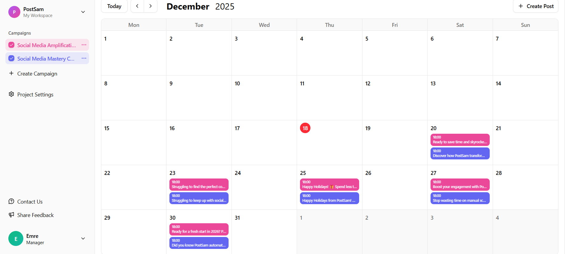 PostSam, içerik üreticileri ve küçük ekipler için sosyal medya yönetimini otomatiğe bağlamaya odaklanan bir girişim olarak konumlanıyor. Platform, markanızın ne yaptığını ve kimi hedeflediğini öğrendikten sonra içerik fikirleri üretiyor, metinleri sizin marka tonunuza uyarlıyor ve içerikleri belirli bir takvime göre planlayıp yayımlayabiliyor. Böylece kullanıcı, haftada kısa bir kontrol süresi ayırarak sosyal medya varlığını sürdürülebilir şekilde canlı tutmayı hedefliyor.