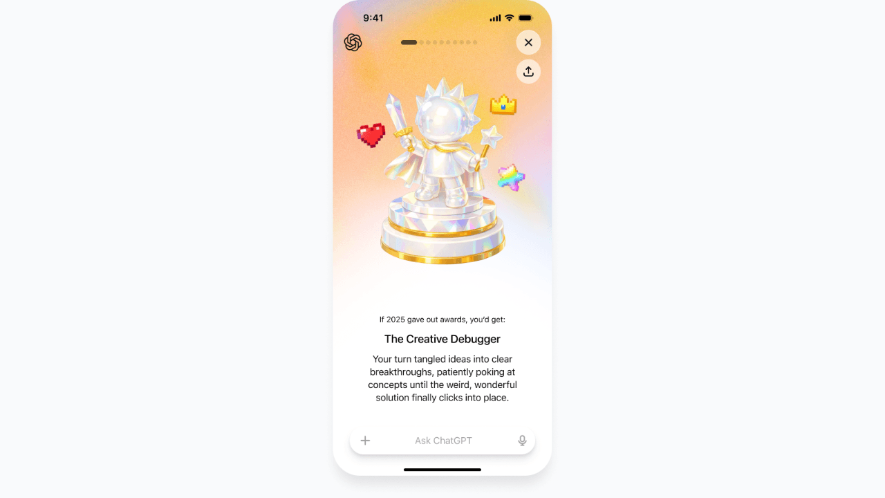“Your Year with ChatGPT”, temel olarak kullanıcıların sohbet geçmişlerinden yüksek seviyeli temalar çıkarıyor ve ChatGPT kullanımına dair bazı istatistikleri bir araya getiriyor. Kaç mesaj gönderildiği, hangi konuların öne çıktığı ya da kullanım tarzına göre oluşturulan şablonlar bu özetin parçaları arasında yer alıyor. Deneyimin daha eğlenceli bir tona sahip olması için yılın kısa bir şiirle anlatıldığı bir bölüm, görsel bir özet ve kullanıma göre verilen sembolik “ödüller” de sunuluyor. Verilen örneklere göre, ChatGPT’yi yoğun şekilde problem çözme ya da fikir geliştirme için kullananlara “Creative Debugger” gibi etiketler verilebiliyor.