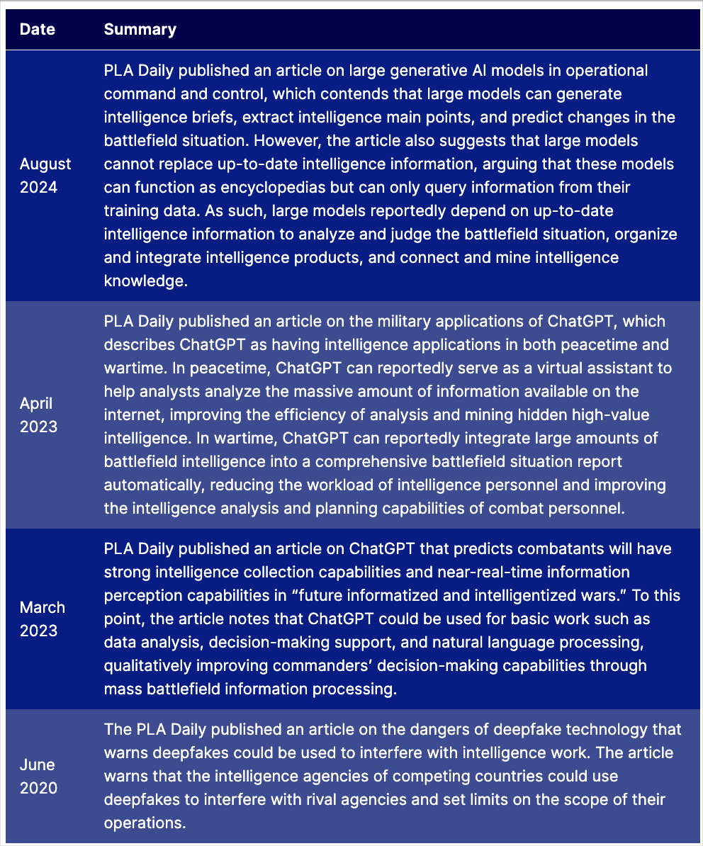 Insikt Group ve Recorded Future'ın paylaştığı araştırmaya göre; PLA, Meta ve OpenAI gibi yabancı kaynaklı modellerin yanı sıra Tsinghua Üniversitesi, Zhipu AI ve Alibaba Cloud gibi Çin merkezli LLM çözümlerini de kullanarak kendi amaçlarına uygun üretken yapay zeka (GenAI) sistemleri oluşturuyor.