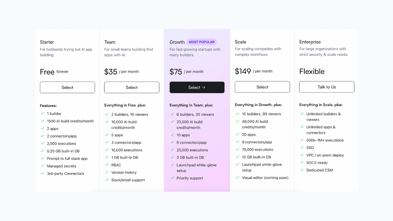 Fiyatlandırma tarafında Build0, farklı kullanıcı profillerine hitap eden esnek bir model benimsiyor. Platform, ürünü denemek ve temel işlevleri keşfetmek isteyen kullanıcılar için ücretsiz planını sunuyor. Daha kapsamlı kullanım senaryoları ve gelişmiş özellikler için ise Team, Growth, Scale ve Enterprise ücretli planları devreye giriyor. Bu planlar, uygulama sayısı, kullanım yoğunluğu ve ek özelliklere göre şekilleniyor. Ücretlendirmeler ise sırasıyla aylık 35 dolar, 75 dolar, 149 dolar seviyesinde değişiyor. Enterprise planında net bir fiyatlandırma olmadığını belirtelim. İşletmenizin ihtiyacına göre fiyat belirleniyor.