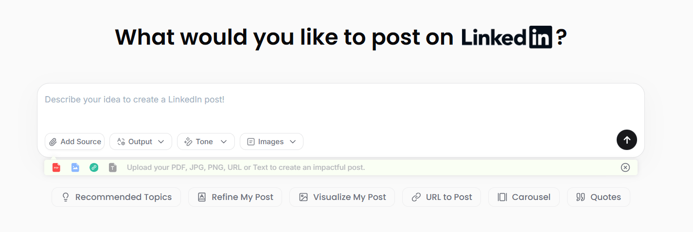 Dynal AI, LinkedIn’de düzenli ve etkili içerik üretmek isteyen profesyoneller, içerik üreticileri ve ajanslar için konumlanan bir LinkedIn ajanı olarak çalışıyor. Kullanıcı, elindeki kaynağı seçip platforma yapıştırarak hızlıca paylaşılabilir bir post akışına dönüştürüyor. Web sitesi linki, PDF ve dokümanlar, görseller, YouTube ya da TikTok videoları ve hatta diğer sosyal ağlardaki paylaşımlar, Dynal AI içinde LinkedIn’e uyarlanmış metin ve çoklu görsel formatına taşınıyor.