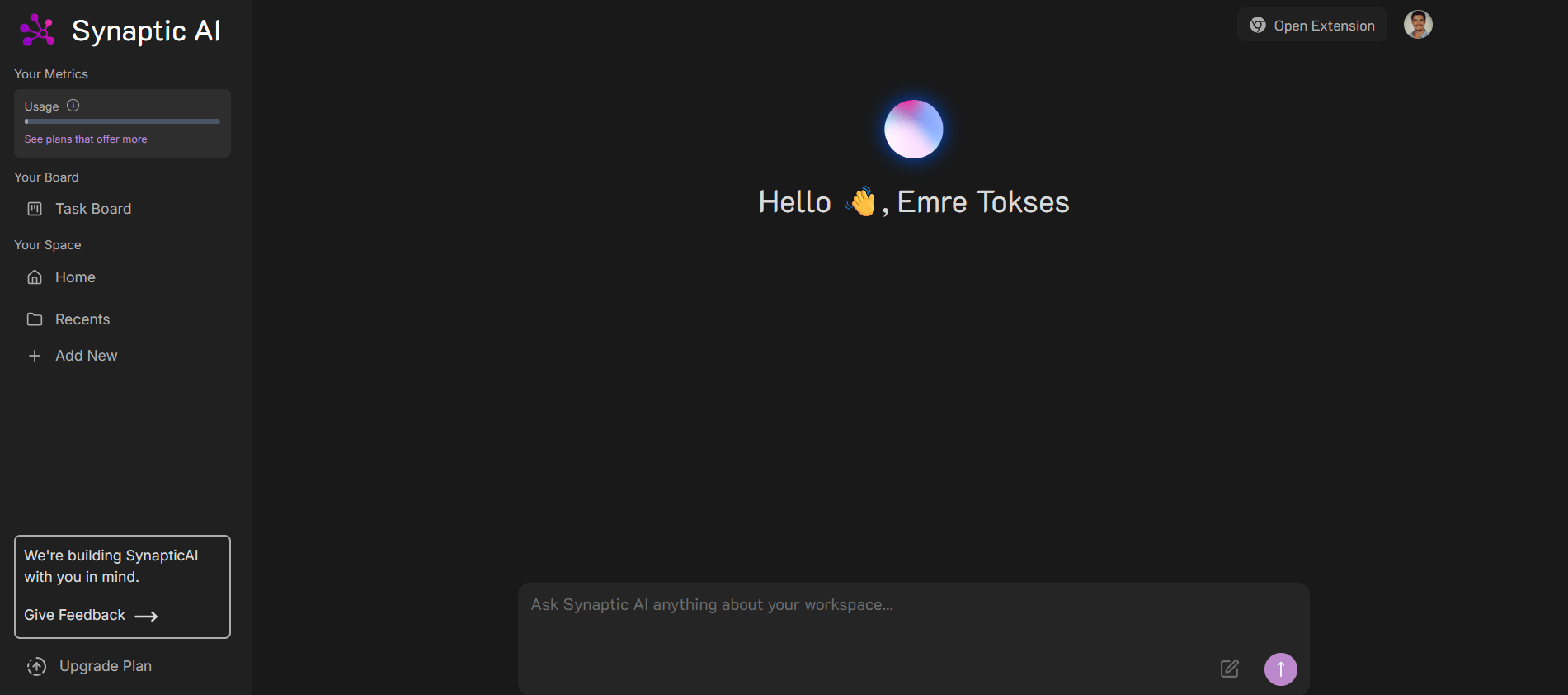 Bilgiyi eyleme dönüştürmek için görev tarafında da bir yapı var. SynapticAI, ihtiyaca göre görev oluşturabildiğini ve bu görevlerin panosu üzerinden yönetilebildiğini belirtiyor. Bu sayede, okunan bir içerikten çıkan yapılacakları aynı çalışma alanında toparlayıp üretkenlik odaklı bir akış kurulabiliyor.